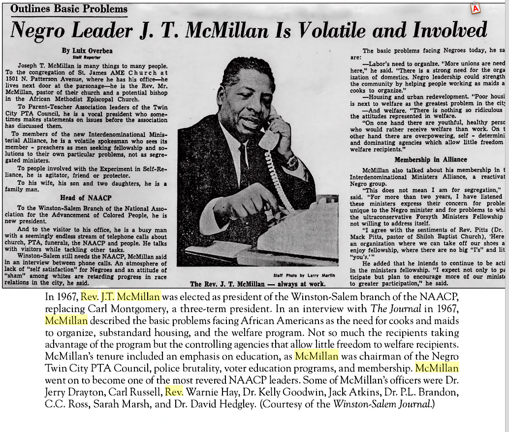 For years many of the human rights action programs for black people were held in St. James A.M.E. Church. McMillan became involved with the Catherine Scott School desegregation suit which was the case that first integrated local schools. He served as president of the local and regional P.T.A. Council to demand complete integration of the officials and leaders of each P.T.A. throughout the school system. According to Woodruff, McMillan is perhaps most noted for 'his meticulous yet firm way of expressing himself." As a member of the state NAACP executive committee and serving as chairman of the committee, McMillan challenged the governor to "put up or shut up" on the question of equal employment. As a result of his persistence as well as other NAACP committee members, the number of black state patrol recruits increased by 20 percent. Much of the gains of the civil rights movement in Winston-Salem stemmed from McMillan's leader ship in the NAACP.