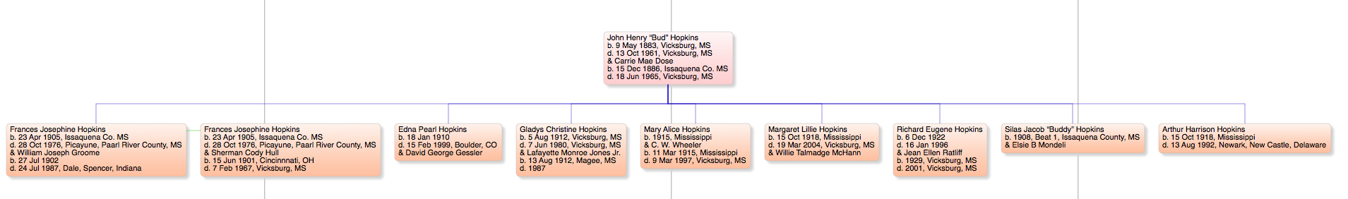 John Henry and Carrie Mae Dose Hopkins family tree, two generations. Zoom your browser to read or go to end of this page.