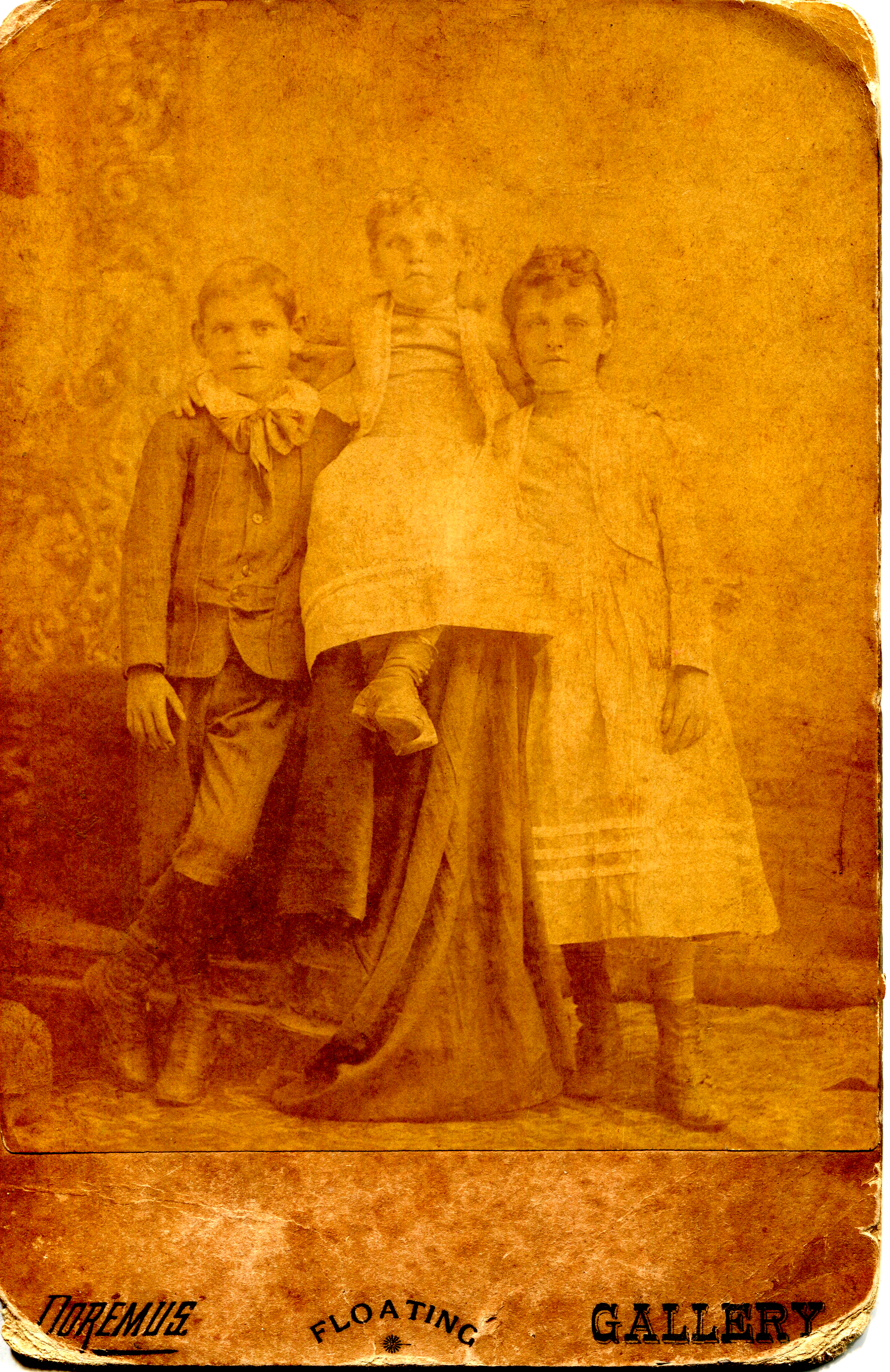 Jacob Christian, Carrie Mae and Mary Sophie Dose, another version. Picture was taken in 1890 aboard the Floating Gallery photography boat, the Flora. The photographer, John P. Doremus, may have sold the business by the time of this photo. (Photo generously given to me by Kimberly Oakes, wife of my cousin, Bill Oakes, whose father, William Warren Oakes had the picture originally. The back says "Sophie Dose, Auntee Dose and Uncle Dose. Jacob and Sophie were twins.