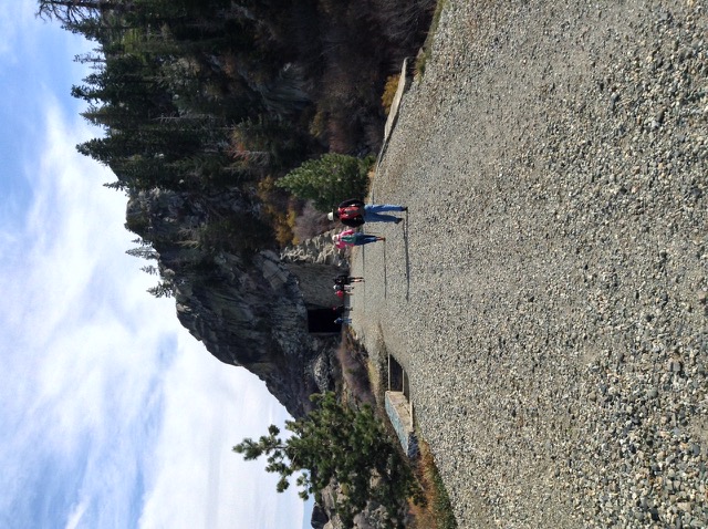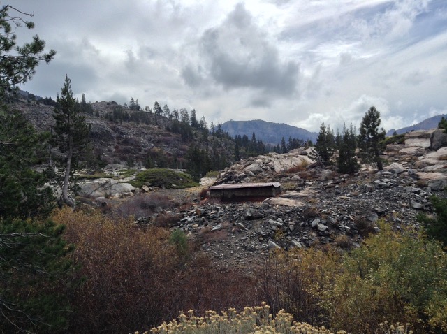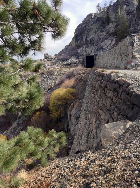 China Wall and Tunnel #8 at Donner Pass. The wall was stacked from the back side by Chinese laborers working 24/7 in a snow cave. Tunnels in this area are no longer active RR track. Nowadays the track goes under Mt. Judah a mile to the south. The newer tunnels accommodate double-decked (= tall) shipping containers. Union Pacific still owns all the old track and has made a few noises about redoing the old tunnels. There’d be a big stink from RR history buffs, I am sure. Some years back when they quit using this track, they removed the old track so they wouldn’t have to pay taxes on the route. There are spots below the old track where you can see piles of old ties. |
