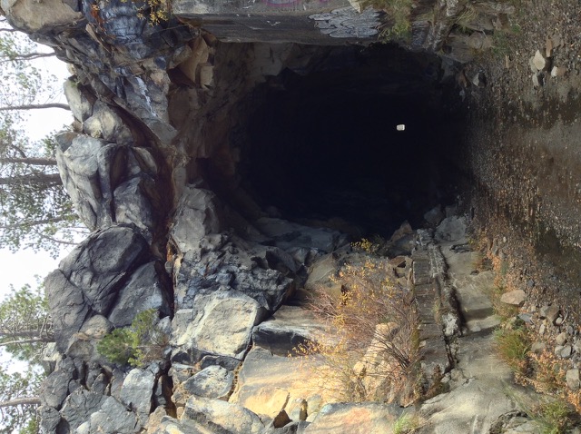 West end of Tunnel #6 by Donner Ski ranch, looking east. Halfway along the tunnel is a vertical shaft which allowed workers to excavate in 4 directions at once. There’s a ton of graffiti in the tunnels. |