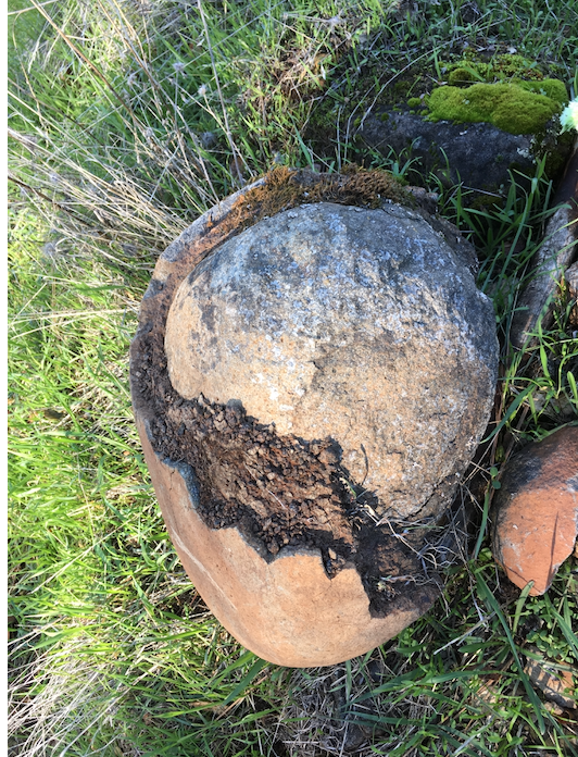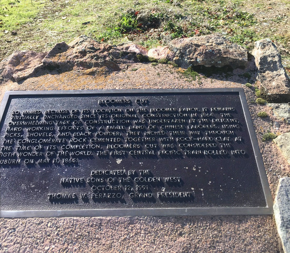 Moving downhill to Auburn... Here’s the historical marker for Bloomer Cut. It’s along the road into a subdivision, but to see the cut requires a 1/3 mile stroll thru empty land between houses. It only took us 19 years to go find it even though it’s a mile walk from home. "Bloomers Cut, So named because of its location on the Bloomer Ranch, it remains virtually unchanged since its original construction in 1864. The overwhelming task of construction was undertaken by the diligent, hard working efforts of a small band of Chinese laborers. Using picks, shovels and black powder, they inched their way through the conglomerate rock cemented together with rock-hard clay. At the time of its completion, Bloomers Cut was considered the eighth wonder of the world. The first Central Pacific train rolled into Auburn on May 11, 186. Erected 1991 by Native Sons of the Golden West, Thomas W. Perazzo, Grand President" |