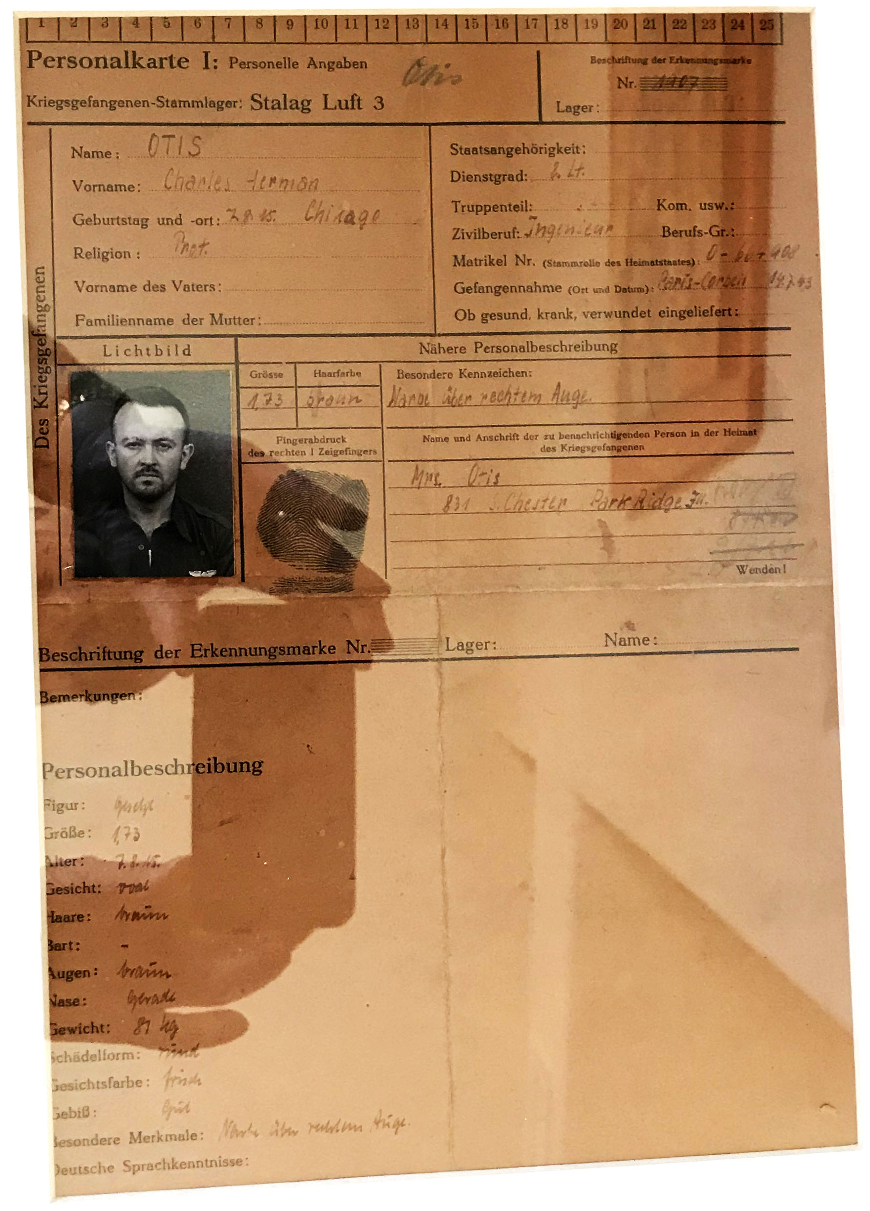 He parachuted to safety when his plane, the Windy City Challenger was shot down. He was discovered by a Roman Catholic priest who tended to his injuries. He was captured by German soldiers and imprisoned in Moosburg, Germany. He was awarded the Purple Heart and the Air Medal with oak leaf clusters for his service. In 1949, Otis built his own house in Park Ridge, IL, where he resided until his death at 83 on January 18, 1999. He was a master with the Park Ridge Masonic Lodge and longtime leader of Boy Scout Troop 50 from the Park Ridge Presbyterian Church. He and Edith had daughter, Nancy Otis Koeber, daughter Faith Otis (William T. Bailey), a son Wesley (Tina). Nancy said he was a man of great integrity and conviction. He had a sister, Joan Otis Clemens. Charles is buried in Evergreen Cemetery, Barrington, IL.