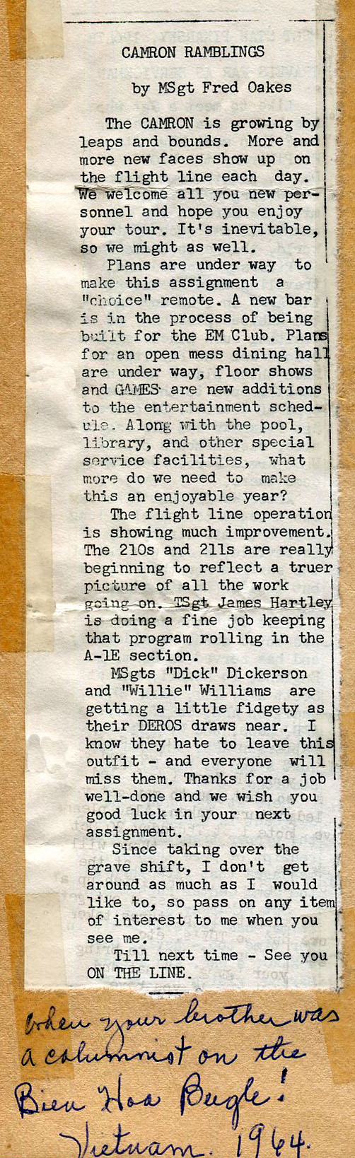 Column in "Bien Hoa Bugle" by MSgt Charles Fredrick Oakes, 1964 The title "Camron" refers to Consolidated Aircraft Maintenance Squadron (CAMRON) | |