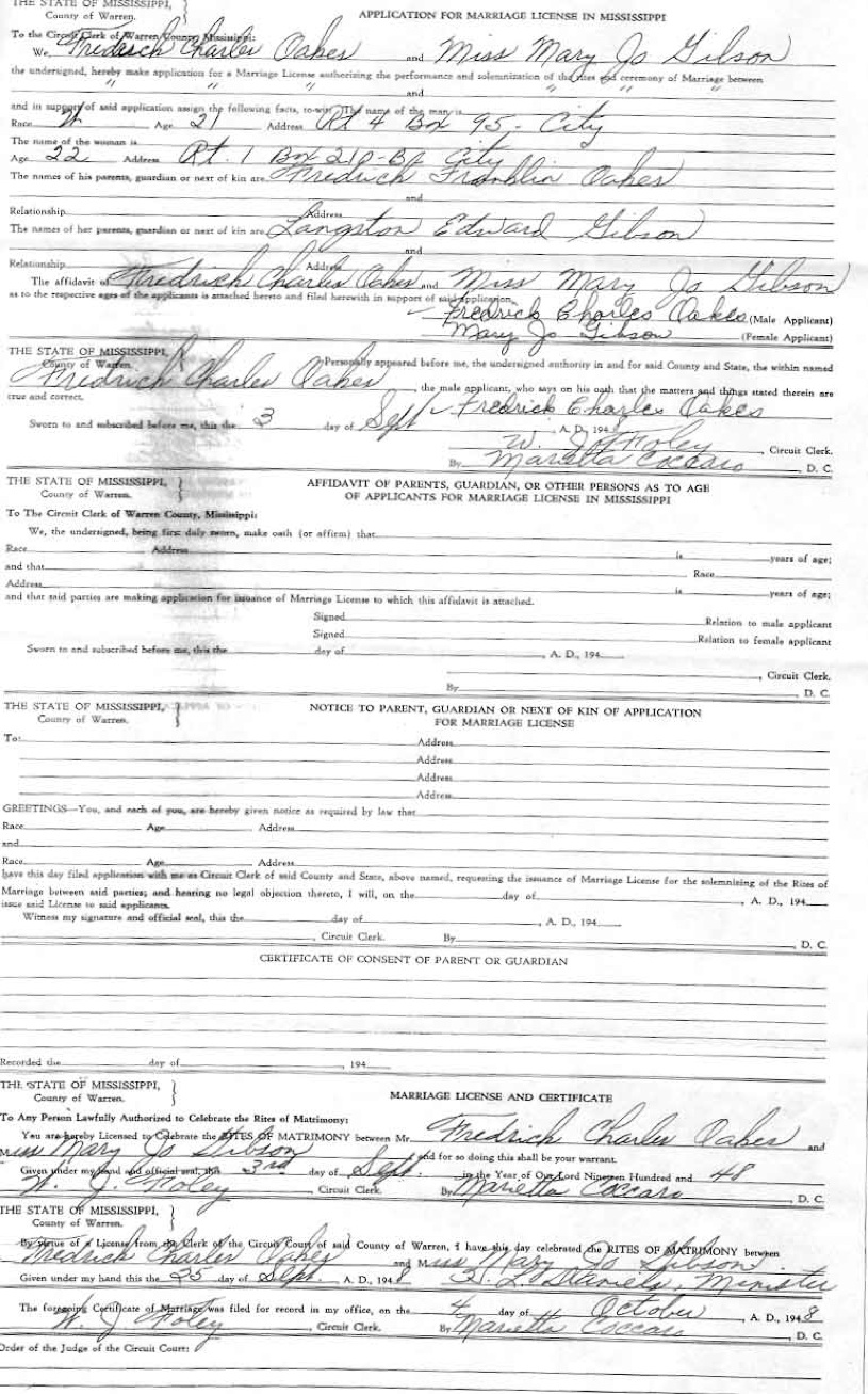 Fredrick Charles Oakes and Mary Jo Gibson’s Marriage Certificate, Vicksburg, MS, 1948