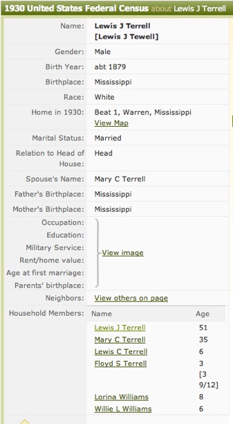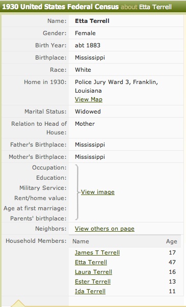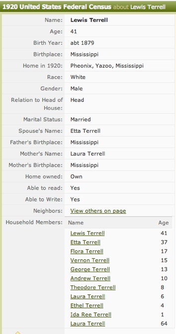 Conrad’s father, Lewis Terrell, appears in the 1920 Census with another wife and large number of children. They lived in Phoenix, MS, which was where Fred Oakes might have first met them. In the 1930 Census, his first wife Etta and a number of the children are living in Franklin Parish Louisiana, she is listed as a “Widow.” Fred Oakes left a story on one of his tapes that relates. He and Lewis Terrell in 1923 are both working at the Y & MV Railroad. He said Lewis was from Phoenix and enjoyed some drinking and gambling. He described Lewis Terrell as slow in speaking. He would take three deep breaths before responding to a question. Around 1927 or 1928, Mr. Terrell was required to fill out papers for US Income Tax. Fred Oakes and Terrell went to the tax office which was filled with people making applications. At the time, both were working for Y & MV Railroad in Vicksburg. The tax clerk asked him his name, after a long pause he said, “L. J. Terrell.” The clerk next asked what was his occupation. He said, “Car knocker.” This was a nickname for a railroad mechanic. Then the clerk asked if he had any dependents? Silence was followed by “ Two wives and 13 children. A wife and 10 children in Phoenix and a wife and 3 children in Vicksburg.” (The numbers remembered by Fred Oakes were probably exaggerated, since the census records would indicate 8 children in Phoenix and 2 in Vicksburg.) All noise in the room stopped as everyone in the room waited for the clerk’s reaction. The clerk admonished him, “This is official business.” He demanded that Terrell take this interview seriously. Mr. Terrell said, “ I didn’t come up here to play marbles. A man in my position wouldn’t joke about this.” Louis next volunteered that he was paying alimony to the wife in Phoenix. The clerk then ask if any of his children were working? Louis said, “I don’t know that, but I do know that those that are don’t make enough to hid their asses.” The clerk asked how much he made during the year? “Thirteen hundred dollars,” he replied. The clerk ended the interview with, “Mr. Terrell, unless you strike oil, don’t bother to ever come back to this office.” This story would indicate that he and Etta were divorced. Whether he died in a short interval between census collection in MS and LA or whether the widowed designation by Etta was an error is unknown.