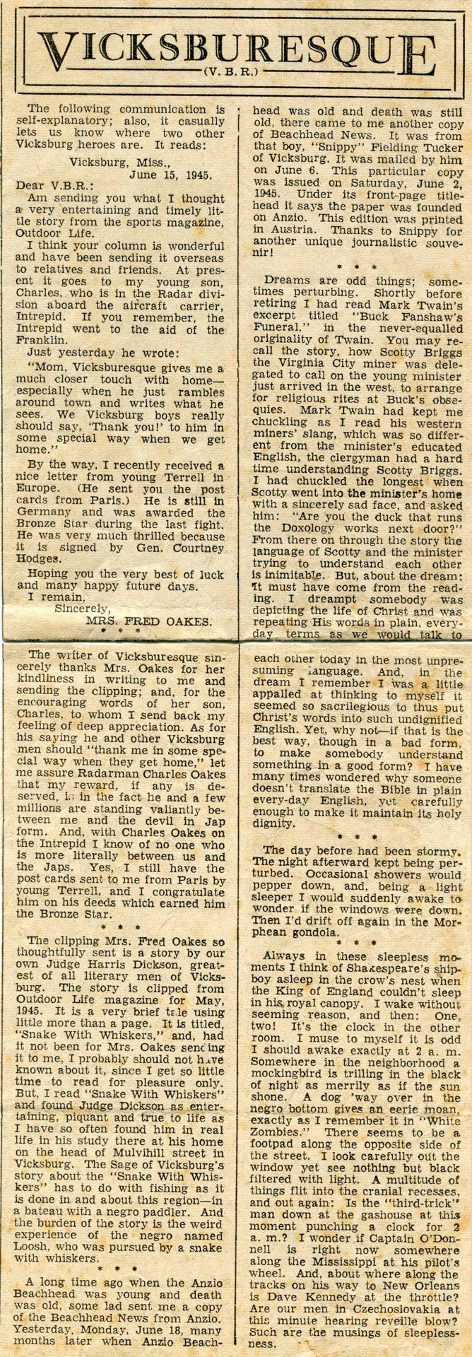15 June: The “Young Terrell” referred to in the article above was a family friend. His name was Louis (Lewis) Conrad Terrell. The 1930 Census has him born 1924. In that census, his father was Lewis J. (age 51), his mother (35) was Mary C., and he had a brother Floyd S. (4). His father was manager of Warren County Prison Farm at Ballground, MS, on Highway No. 3 north of Vicksburg. All were listed as born in MS. Records show that Conrad enlisted in the U. S. Army 17 August 1943, at Camp Shelby, MS. It lists that he had four years of high school education, was a clerk, and was single. He was released from service Dec. 25, 1945. As the article above indicates, Conrad participated in the liberation of Paris and earned a Bronze Star.