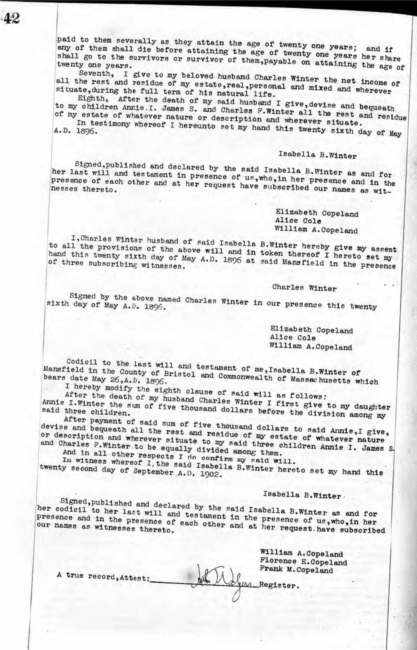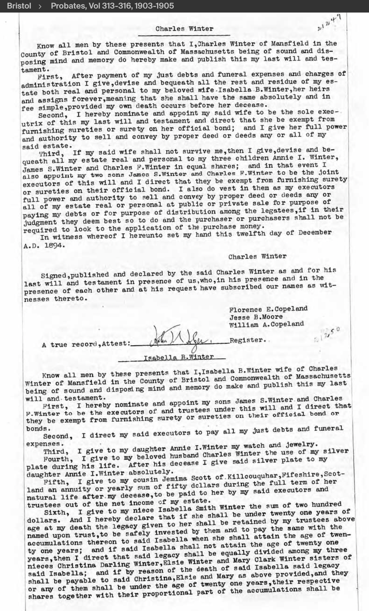 Taken in Wrentham or Mansfield. Carrie was married to Charles Frederick Winter, son of Charles Winter who came over from Scotland. She was the mother of Beth Winter Gommi. |
