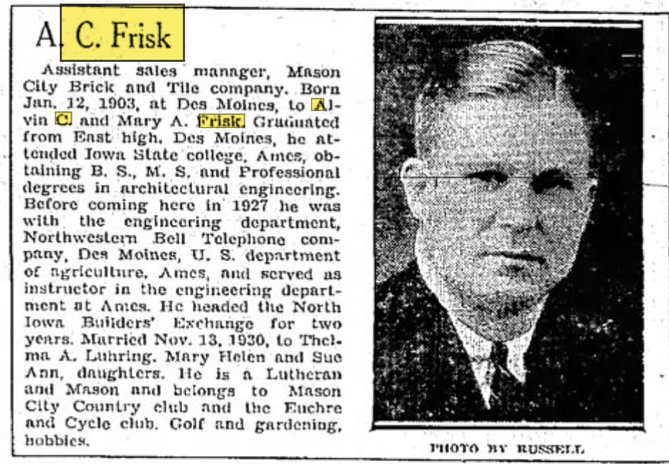 12 Maybe Edwin Julius Frisk, older brother of Alvin Frisk. He was born 1874, and worked as a printer at age 15. He was depHe was a lawyer and served two terms as city solicitor and city postmaster in Des Moines. He was permit supervior of the Iowa Liquor Control Commision when he died in 1952. He married Minnie Youngberg in 1904. They had one daughterMrs. Edwin F. (Rilla) Hull. and two sons Richard and Felix. A photo from his obituary is below.