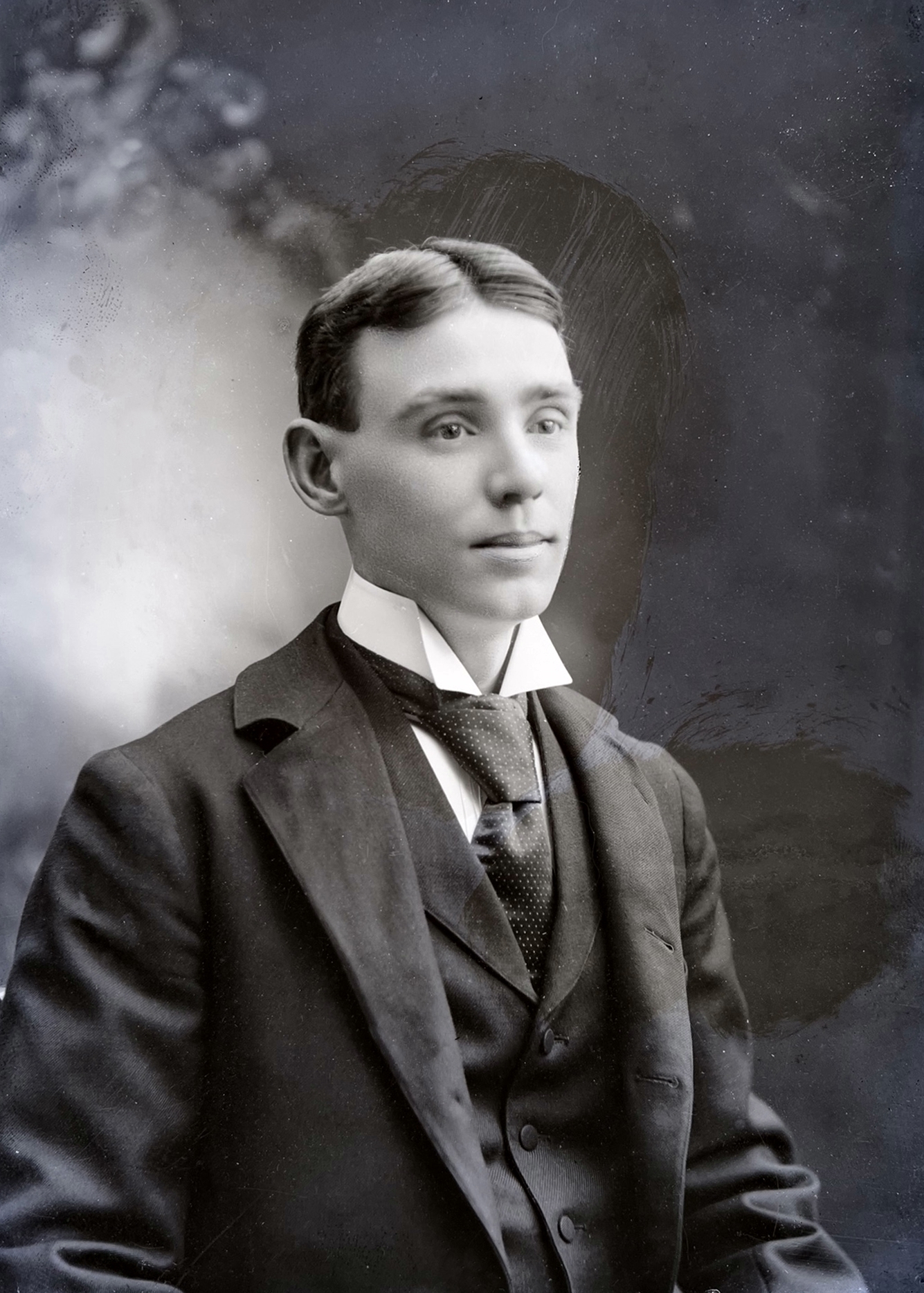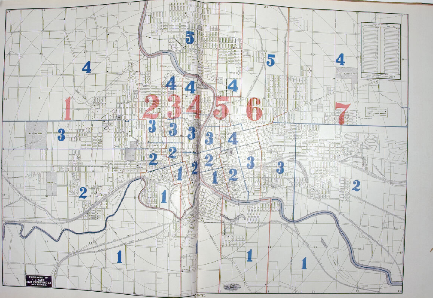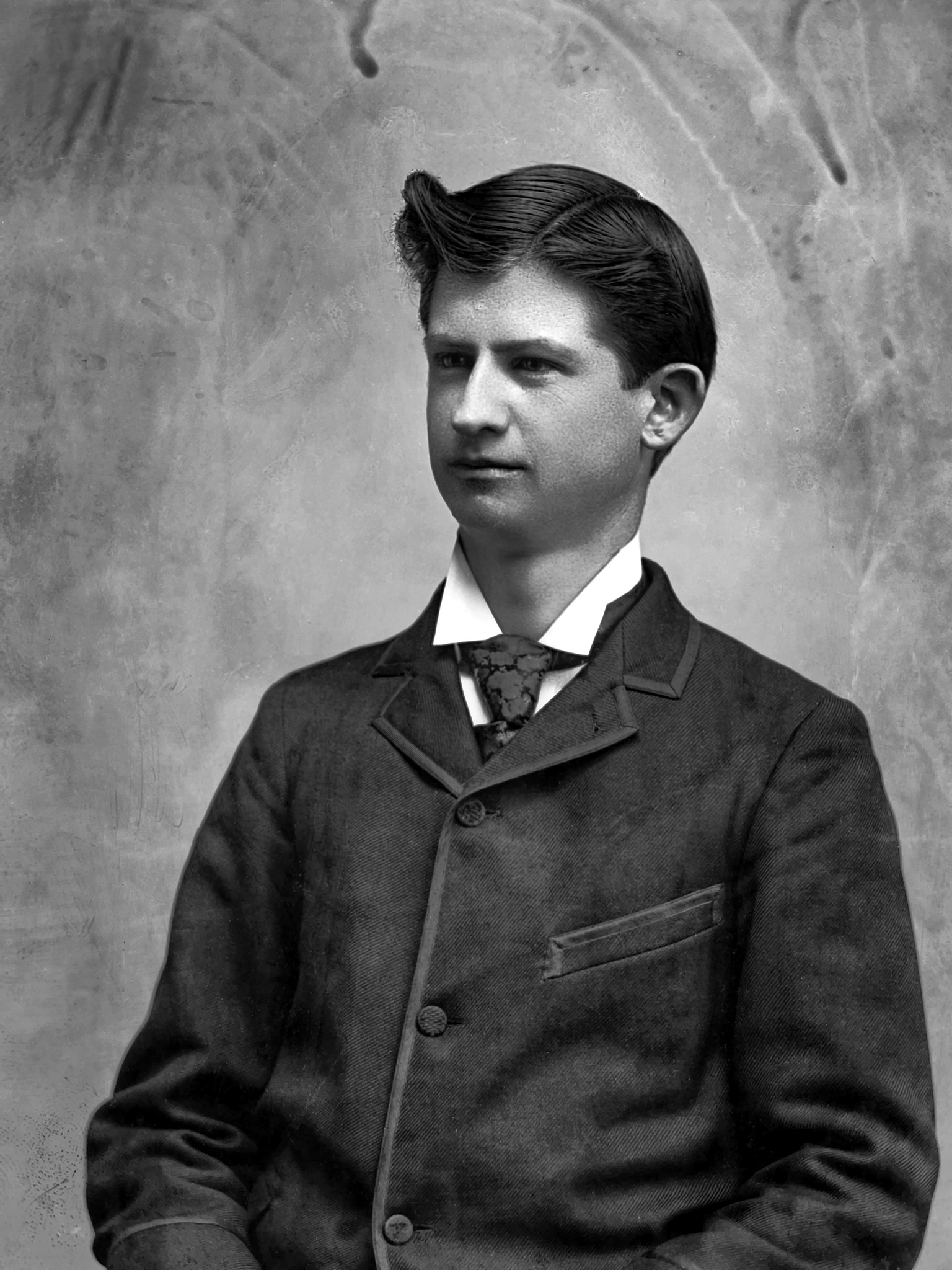16 There are two telephones on the desk, both candlestick phones which had their beginings in late 1890s. The one on right is older model and the one on the left is newer and has rotatable mouth piece. In the calendar on the desk, it is clear that the 1st is a Wednesday and there are 31 day in that month. Likely this picture was taken after he became a clerk for the city of Des Moines. Dates available that could match calendar are; July 1903, Nov 1904, March 1905, Aug 1906, Jan and July 1908. The name of the month looks short. I propose July 1903 early in his tenure as the Clerk. There is a map in the background that looks official. It is a map of Des Moines. See 1899 map below. Also below are two photos of photographer's son, Alvin Cecil. Frisk who bears some resemblance to man in picture.