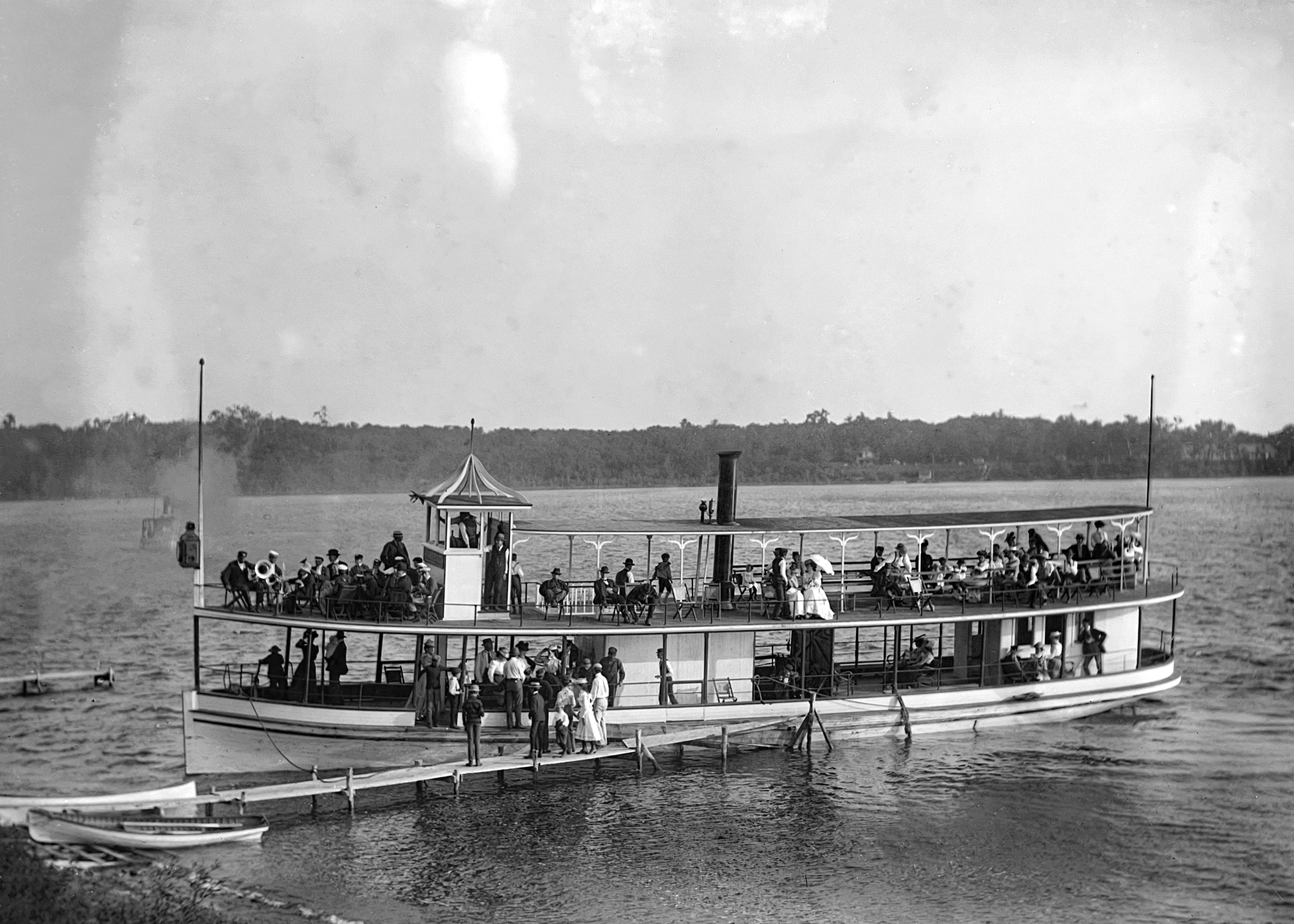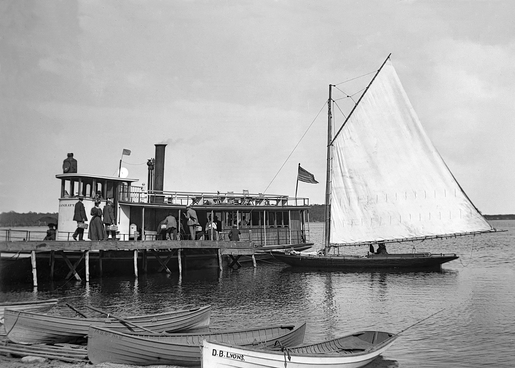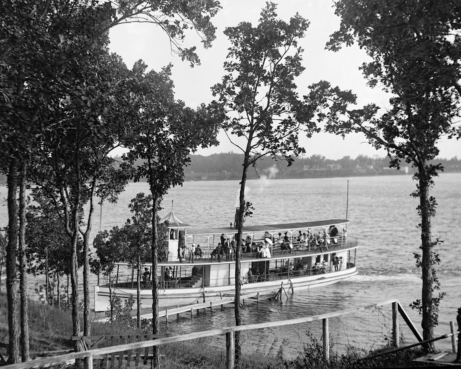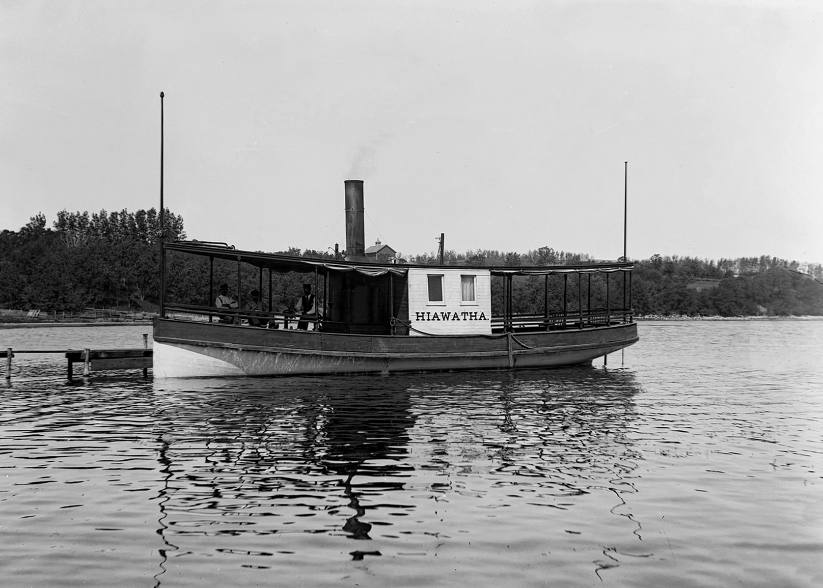 01 The Steamer Okoboji on Spirit Lake in Iowa. She was built with parts and engine from the Steamer Manhattan. An early photo as evidence by lack of name on hull yet. Email to Dennis Murphy: "The Manhattan was constructed in 1884 by a Captain May for operation on West Okoboji Lake. The original name of the ship was the "Ben Lennox". In or around 1894 the ship was sold to the owners of the grand hotel "Manhattan". The Manhattan operated as a transportation vessel for the hotel in our road poor area until 1899 when she became unseaworthy and was broken up. Her parts and pieces were used in the construction of a similar vessel named "Okoboji". We have the red and green running lights from the boats on display at our lowa Great Lakes Maritime Museum. I operate a replica of those old steamers named Okoboji Queen II. Also I am curator of the Maritime Museum. The steam boat era at our lakes coincided with other midwestern lakes. The coming of the trains in the 1880's brought tourists and the boats carried them to all points on our lakes. Stephen Kennedy: Iowa Great Lakes Maritime Museum." |