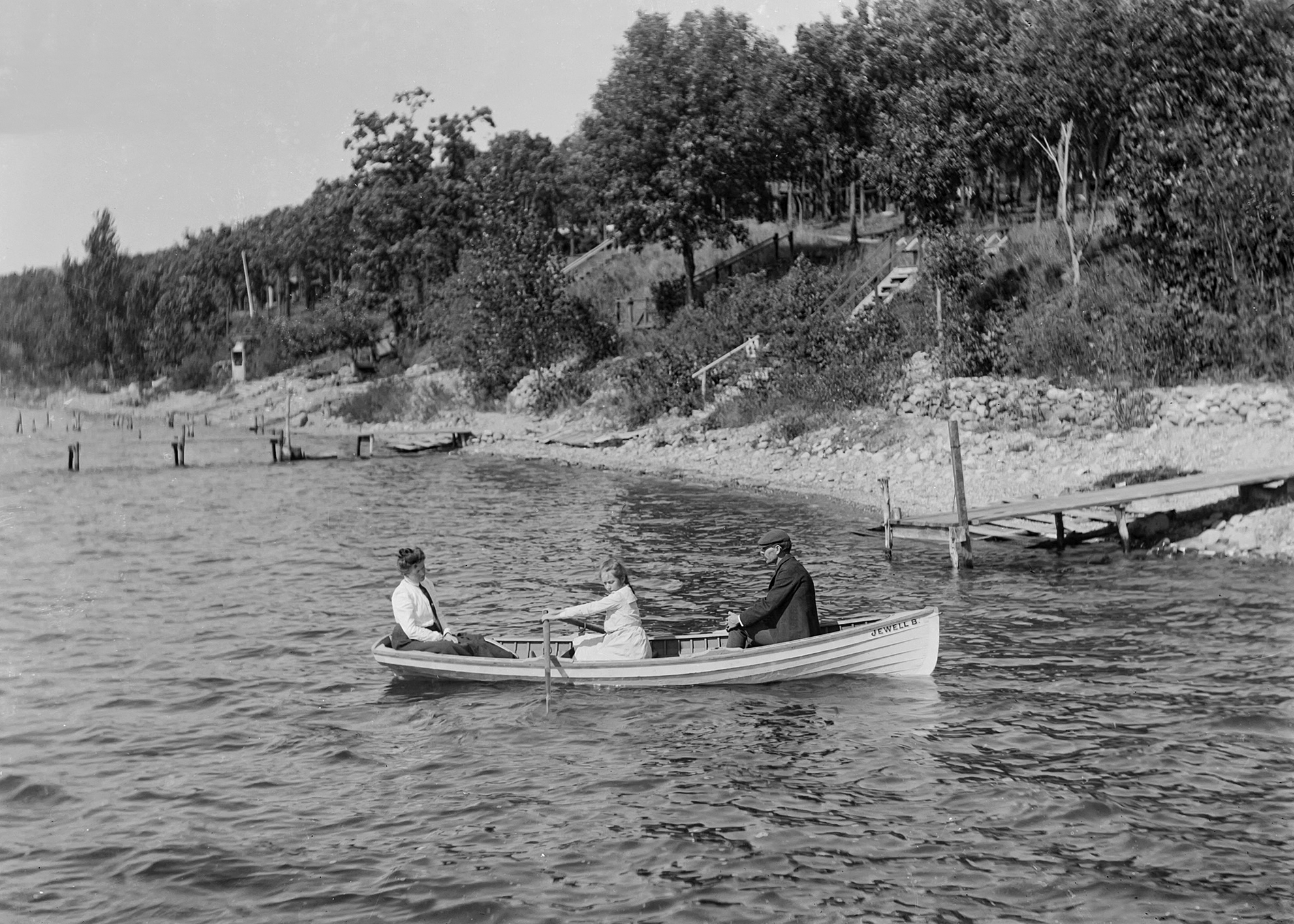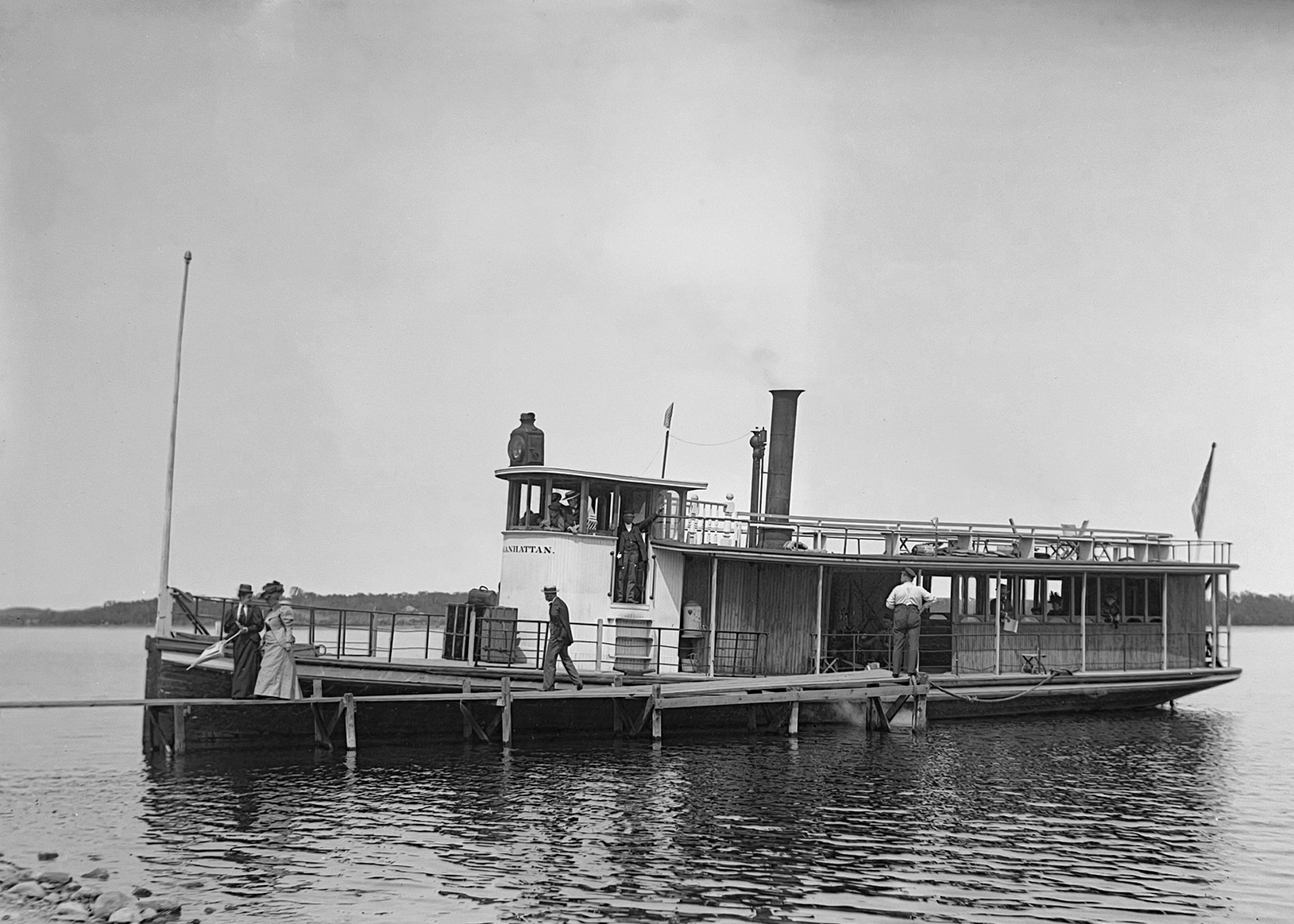 04 The Manhattan Email to Dennis Murphy: "The Manhattan was constructed in 1884 by a Captain May for operation on West Okoboji Lake. The original name of the ship was the "Ben Lennox". In or around 1894 the ship was sold to the owners of the grand hotel "Manhattan". The Manhattan operated as a transportation vessel for the hotel in our road poor area until 1899 when she became unseaworthy and was broken up. Her parts and pieces were used in the construction of a similar vessel named "Okoboji". We have the red and green running lights from the boats on display at our lowa Great Lakes Maritime Museum. I operate a replica of those old steamers named Okoboji Queen II. Also I am curator of the Maritime Museum. The steam boat era at our lakes coincided with other midwestern lakes. The coming of the trains in the 1880's brought tourists and the boats carried them to all points on our lakes. Stephen Kennedy: Iowa Great Lakes Maritime Museum." |