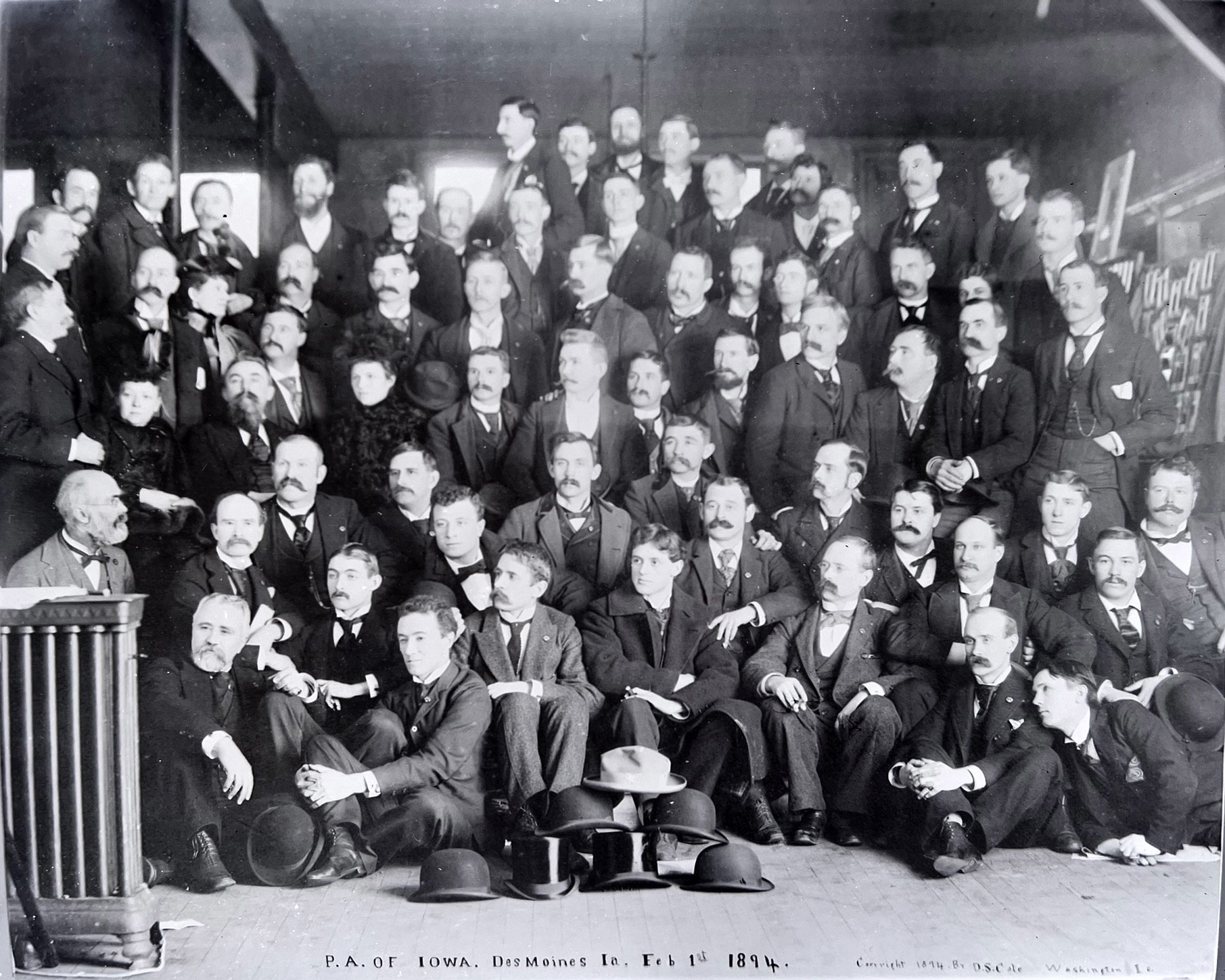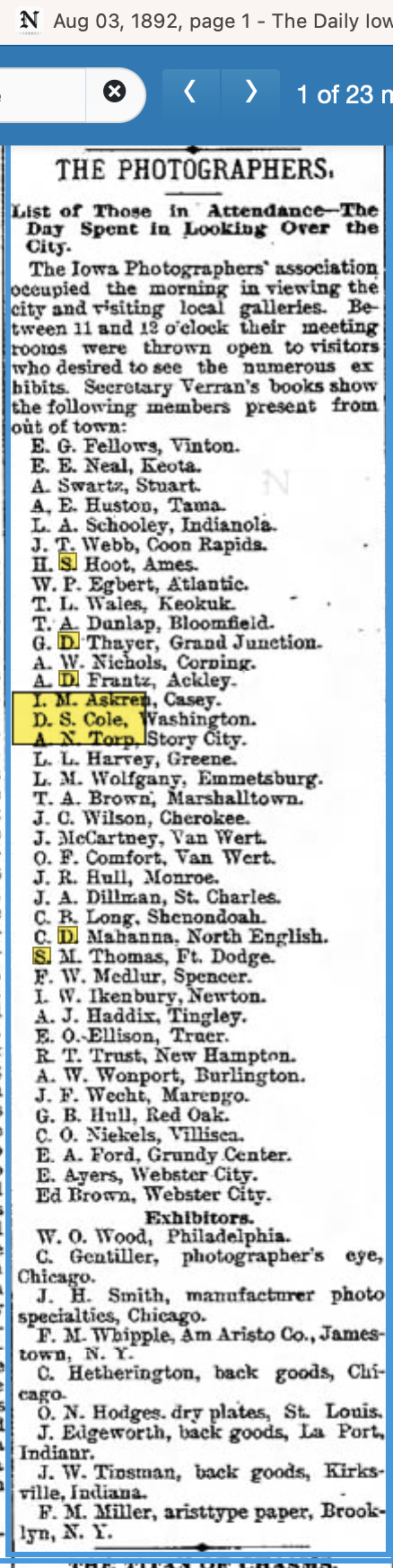 Officers elected at meeting were W. F. Mediar, W. A.Peed, J. A. Rohner, F. W. Webster, D. S. Brown. Other attendees Alexander Gosheim, T. A. Wales, F. H. Clifford, A. T. Parker, J C. Scoles, Below is a list of attendees from meeting two years earlier, likely many present in this photo. The photographer was David S. Cole, born November 22, 1843 in Franklin County, Ohio. At the age of 12 the family moved to Washington County, Iowa. He enlistied at 17 in Company K, Thimithtenth Iowa Volunteer Infantry. During the war he was captured at Atlanta on July 22, 1864 and spent time in Andersonville Prison. He was released April 28, 1865, fourteen days after Lincoln's assasination. Though his father was a blacksmith, his interest was more artistic and after serving in Union Army , he established his photography studio in 1865 in Washington, Iowa. He spent five years making photographs for Northwester Railway and Chicago, Burlington and Quincy Railroad Company in Montana, Wyoming and Dakotas. In 1903 he served as official photographer of 13th Cavalry and spent a year and a half in the Philippines. He died in 1916 and is buried in Elm Grove Cemetery in Washington, Iowa. His photo is at right.