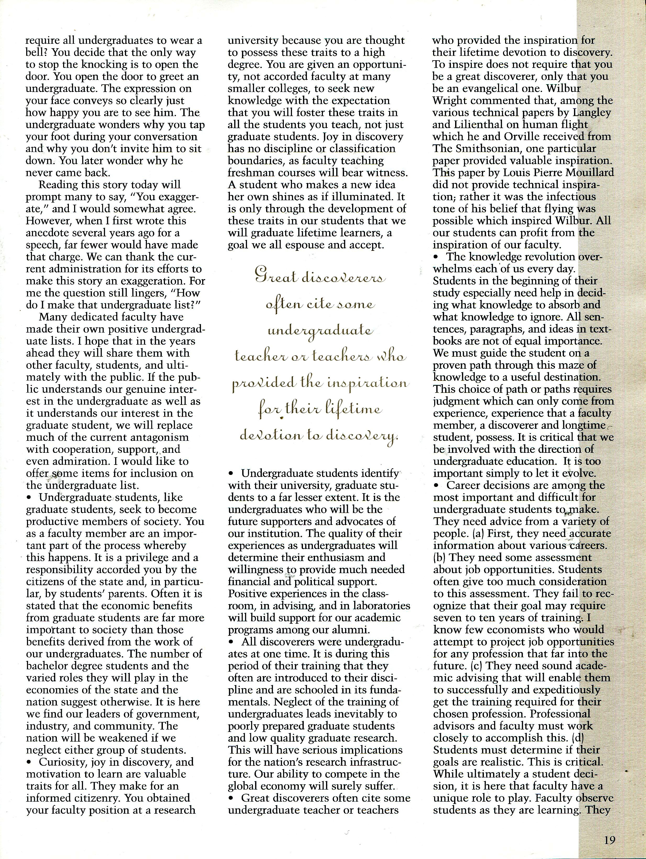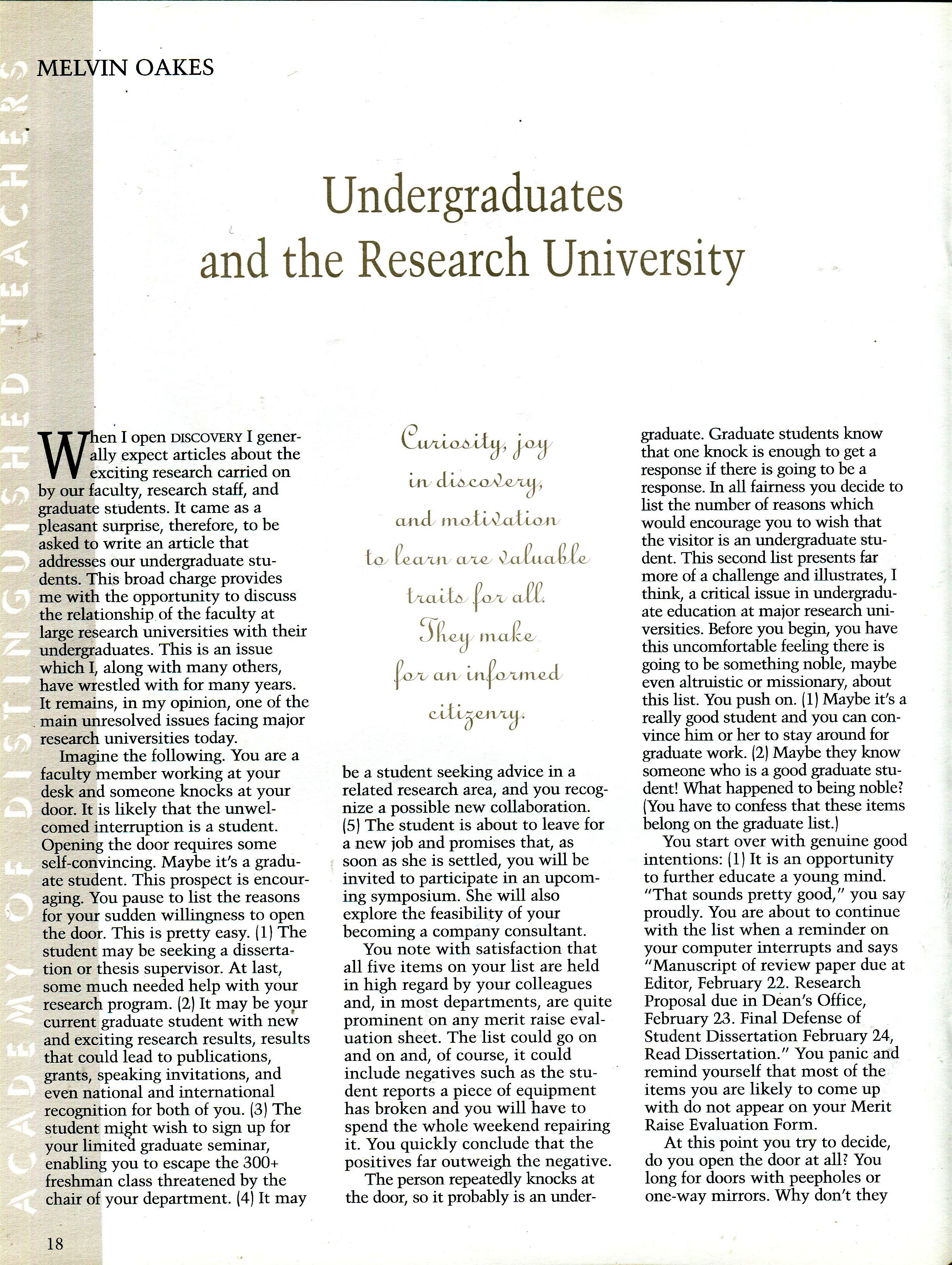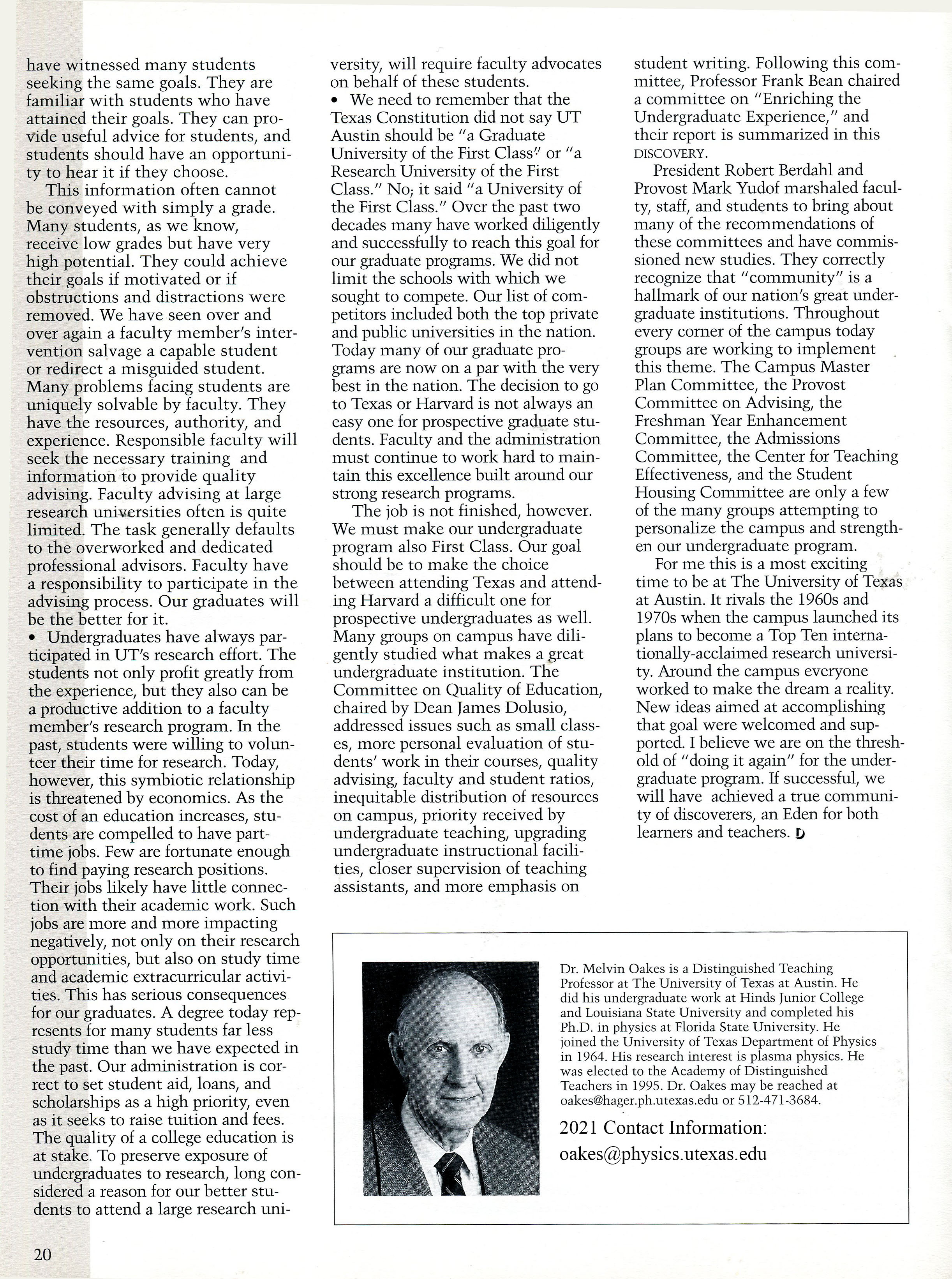 At the time this article was written, undergraduate teaching had fallen on hard times at The University of Texas. The emphasis on graduate research and graduate teaching had consumed the undergraduate program. Very small graduate classes were taught while undergraduate classes had grown in size and fallen in number available. Students complained, justifiably so, that they could not get classes required for graduation. Student discontent reached the point that they sought help from their legislators to intervene. The legislatur threaten to impose teaching requirements. Fortunately, the University hired Robert Berdahl as President. He quickly assessed the situation and immediately focused on correcting the imbalance. He did this with little loss in graduate research and teaching. He deserves much credit for rebalancing teaching and reseach at UT.