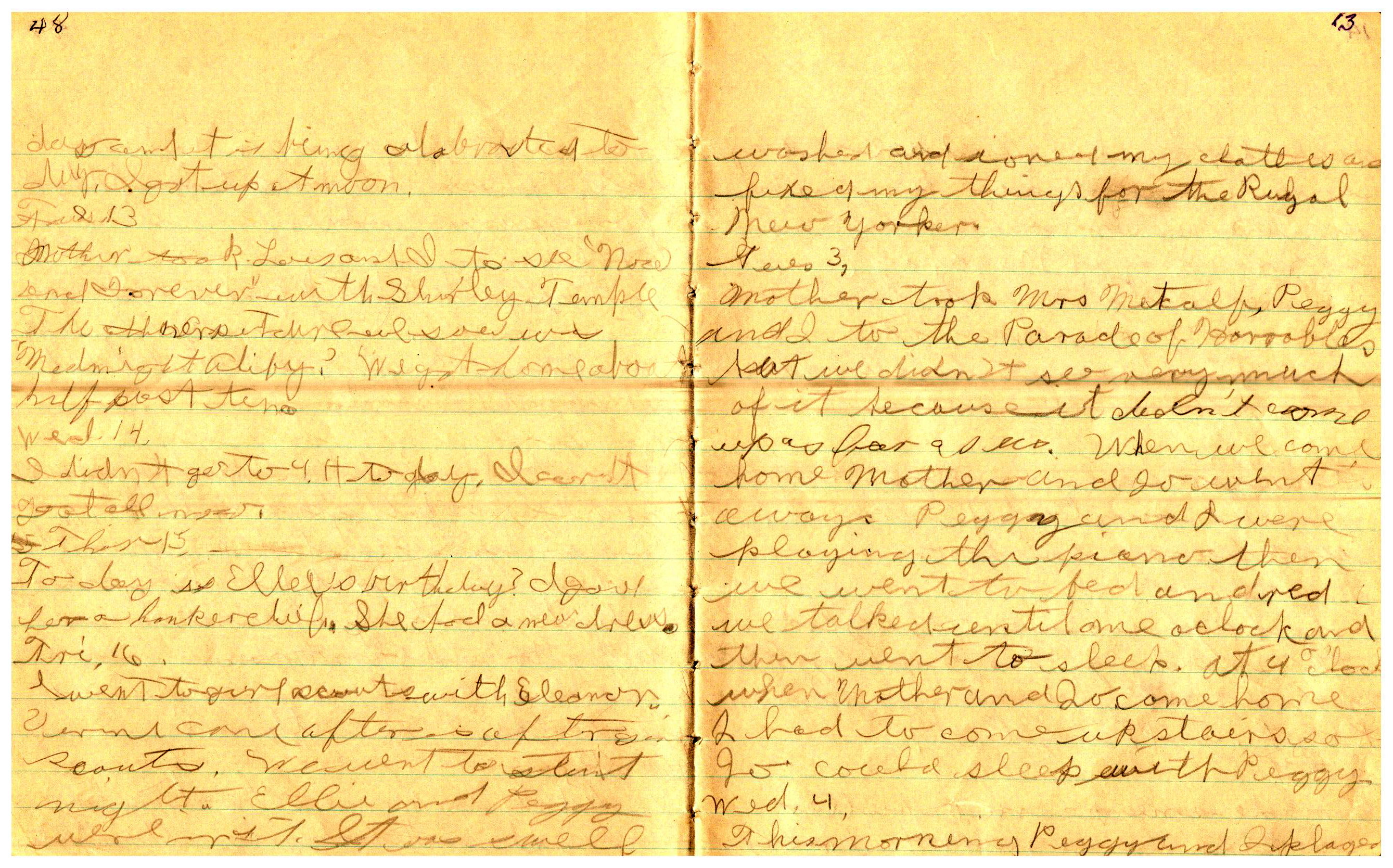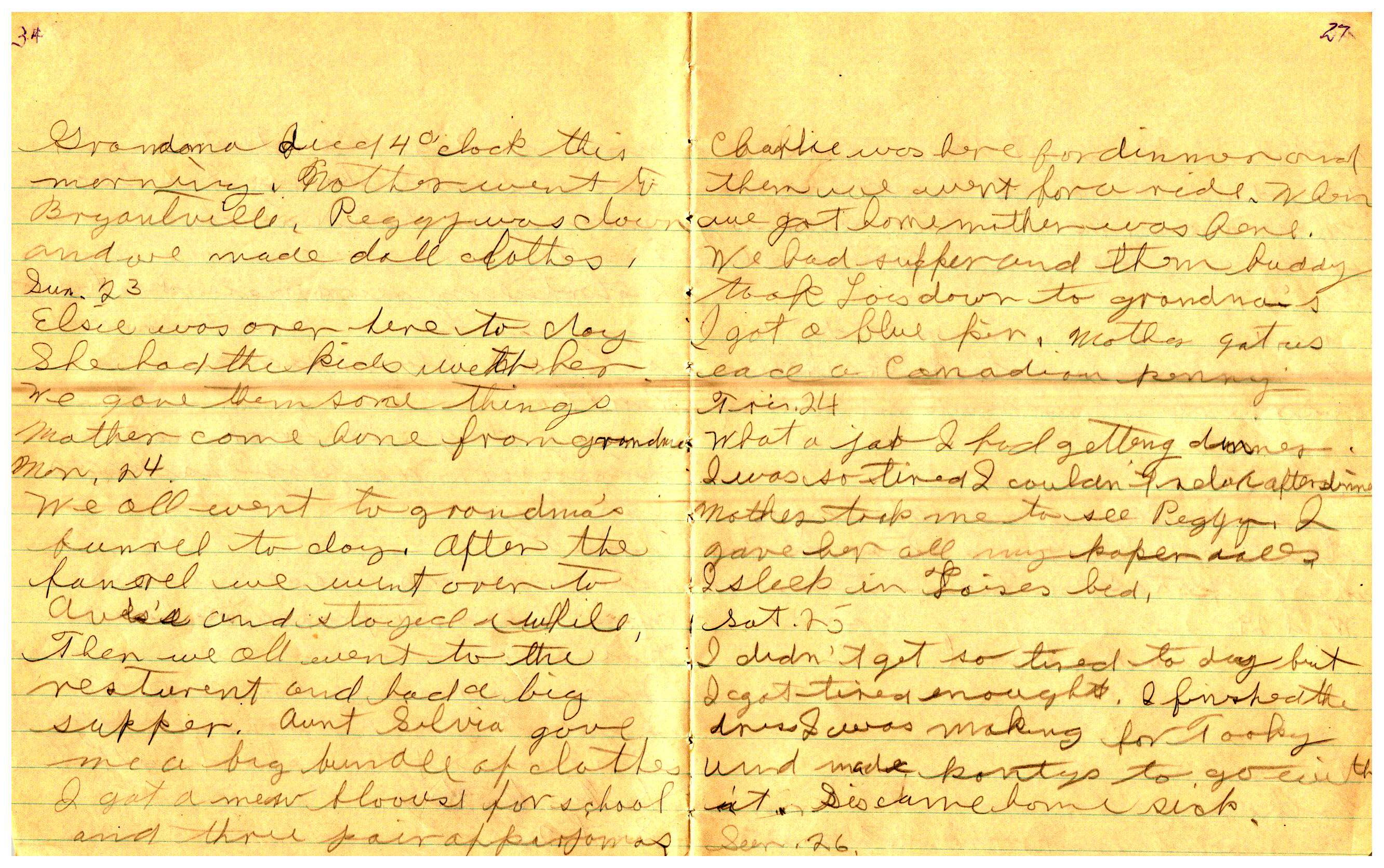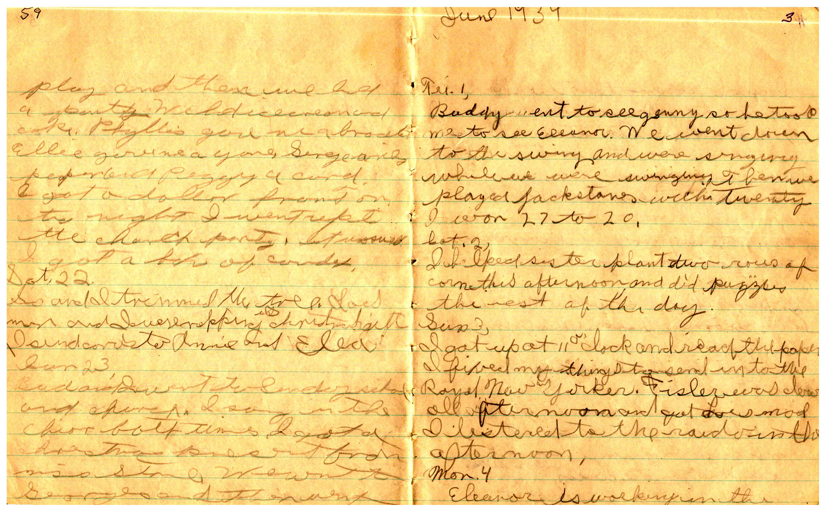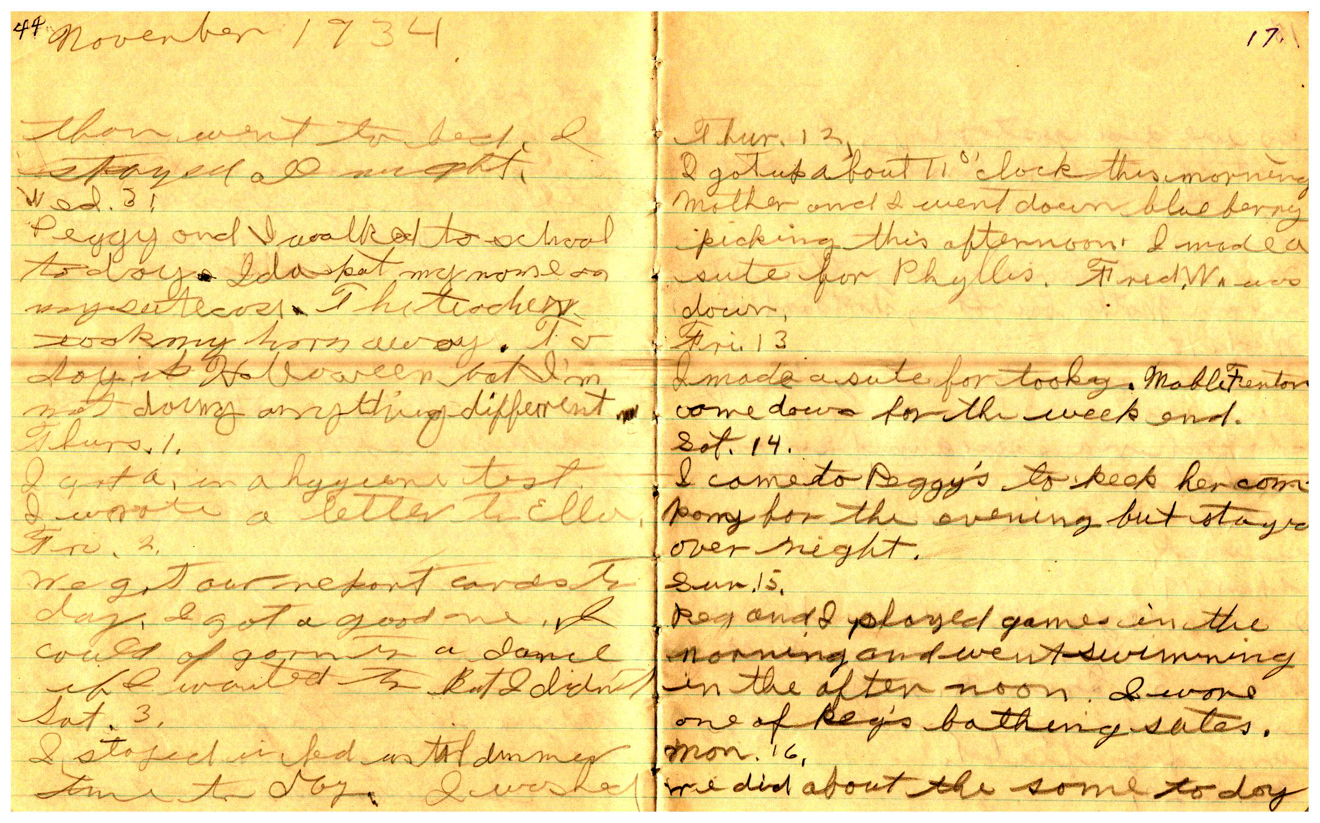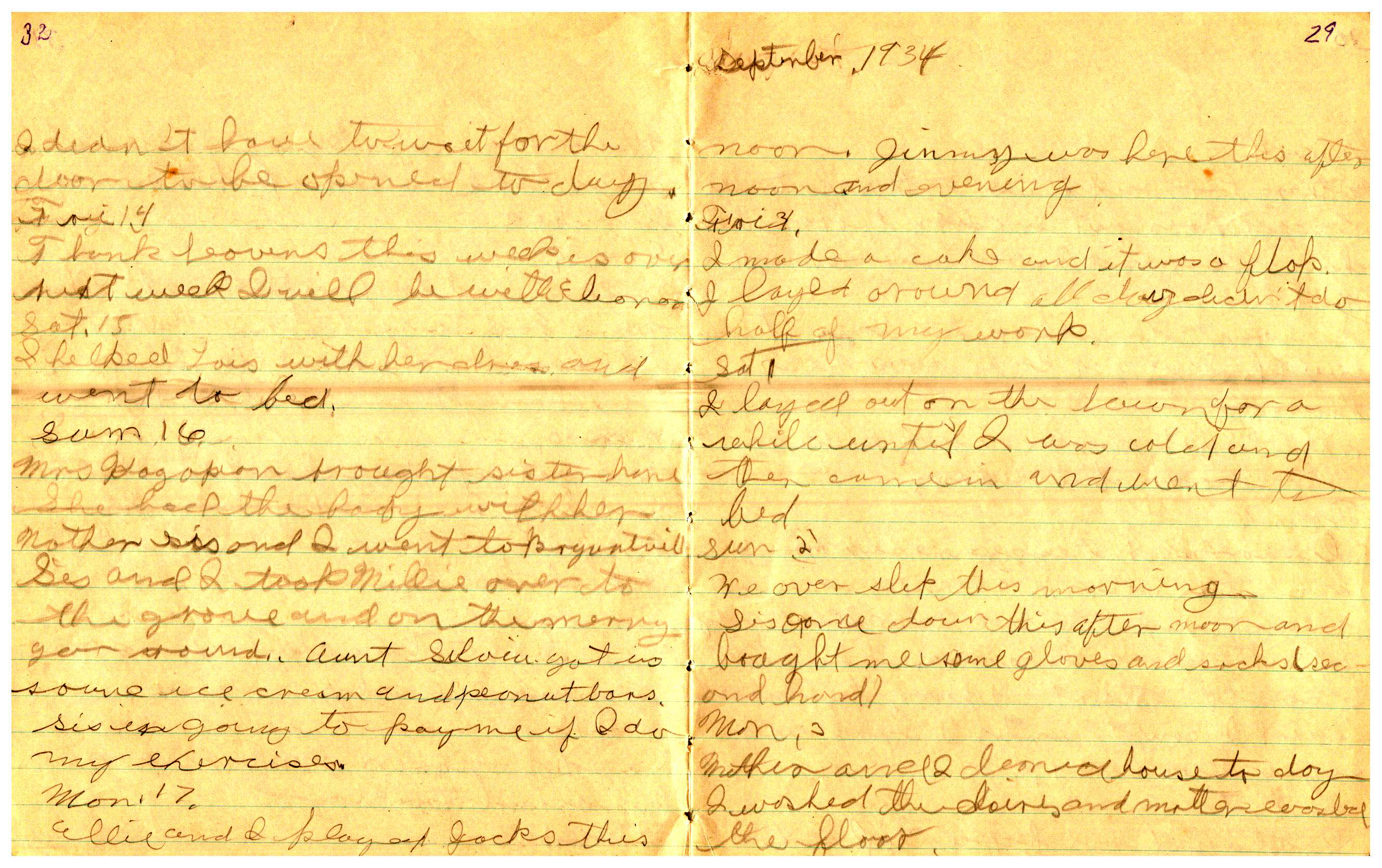 WRENTHAM—Doris Brown, born June 17, 1921, kept a diary Friday, May 25, 1934 to Thursday, December 27, 1934. The diary has been scanned and is below. You must read in a zig-zag pattern following the page numbers. It is hope her entries will be useful at clarifying events in the Brown Family and identifying people she knew in Wrentham, MA.