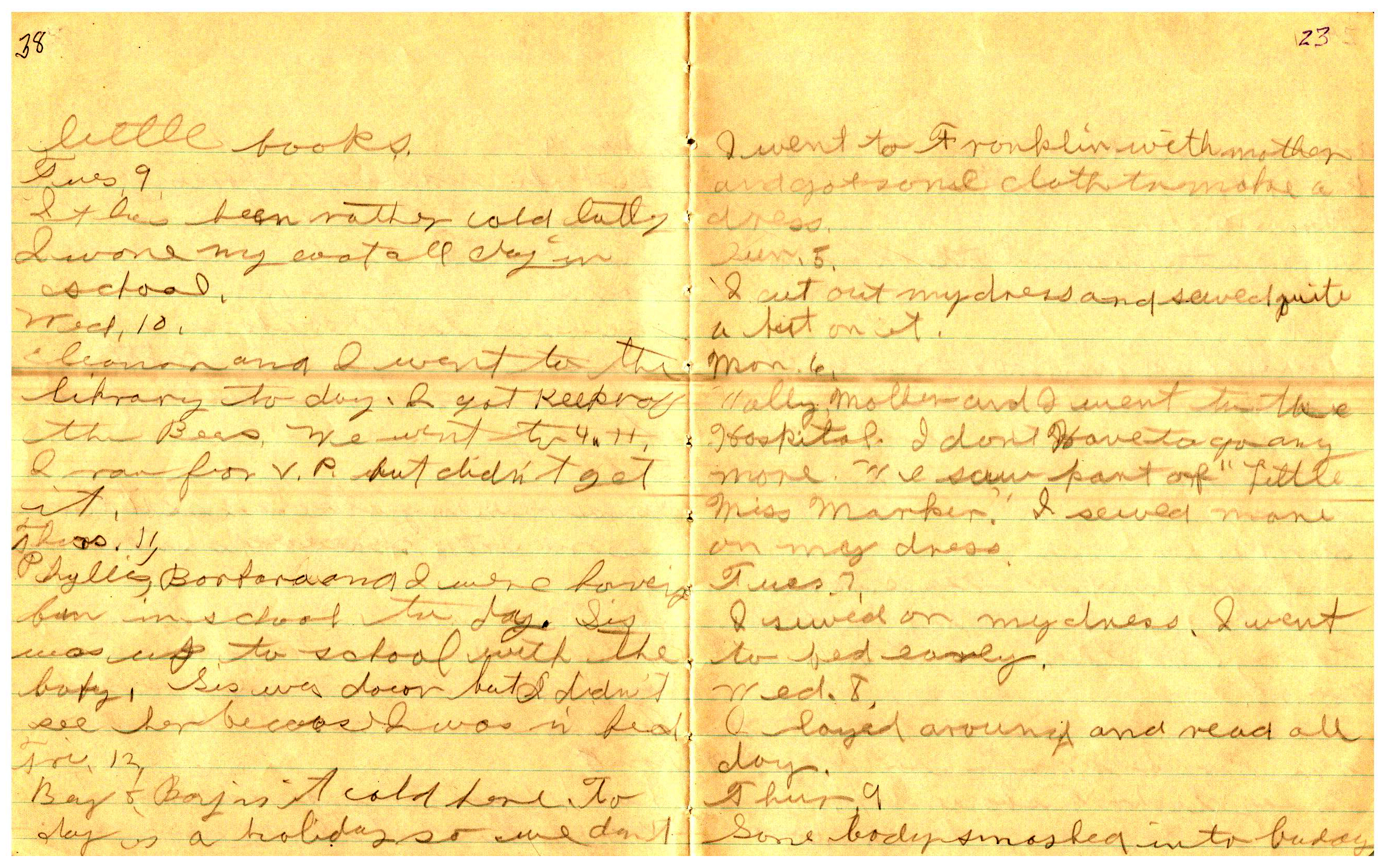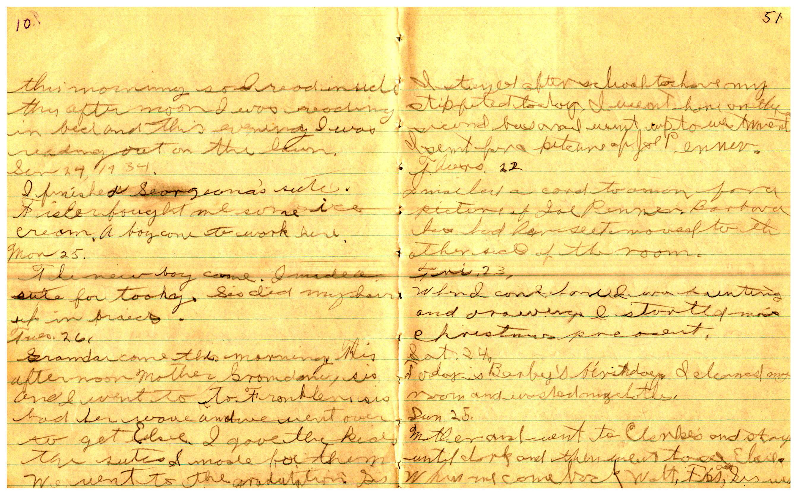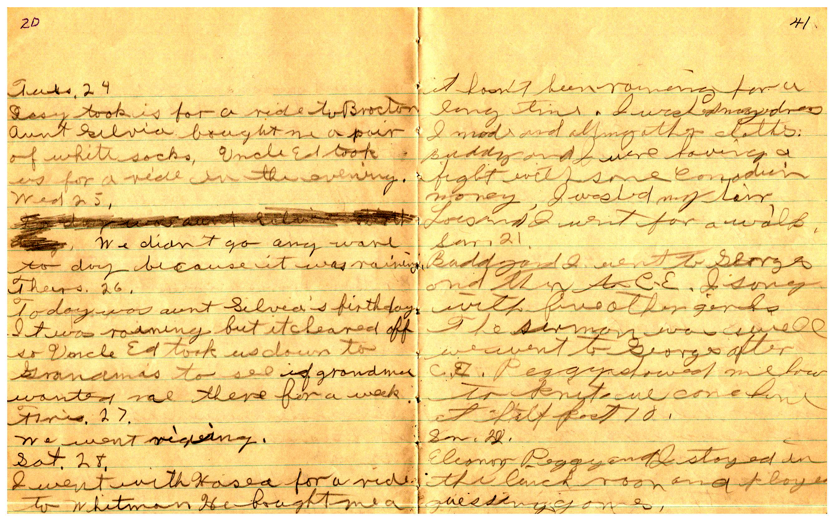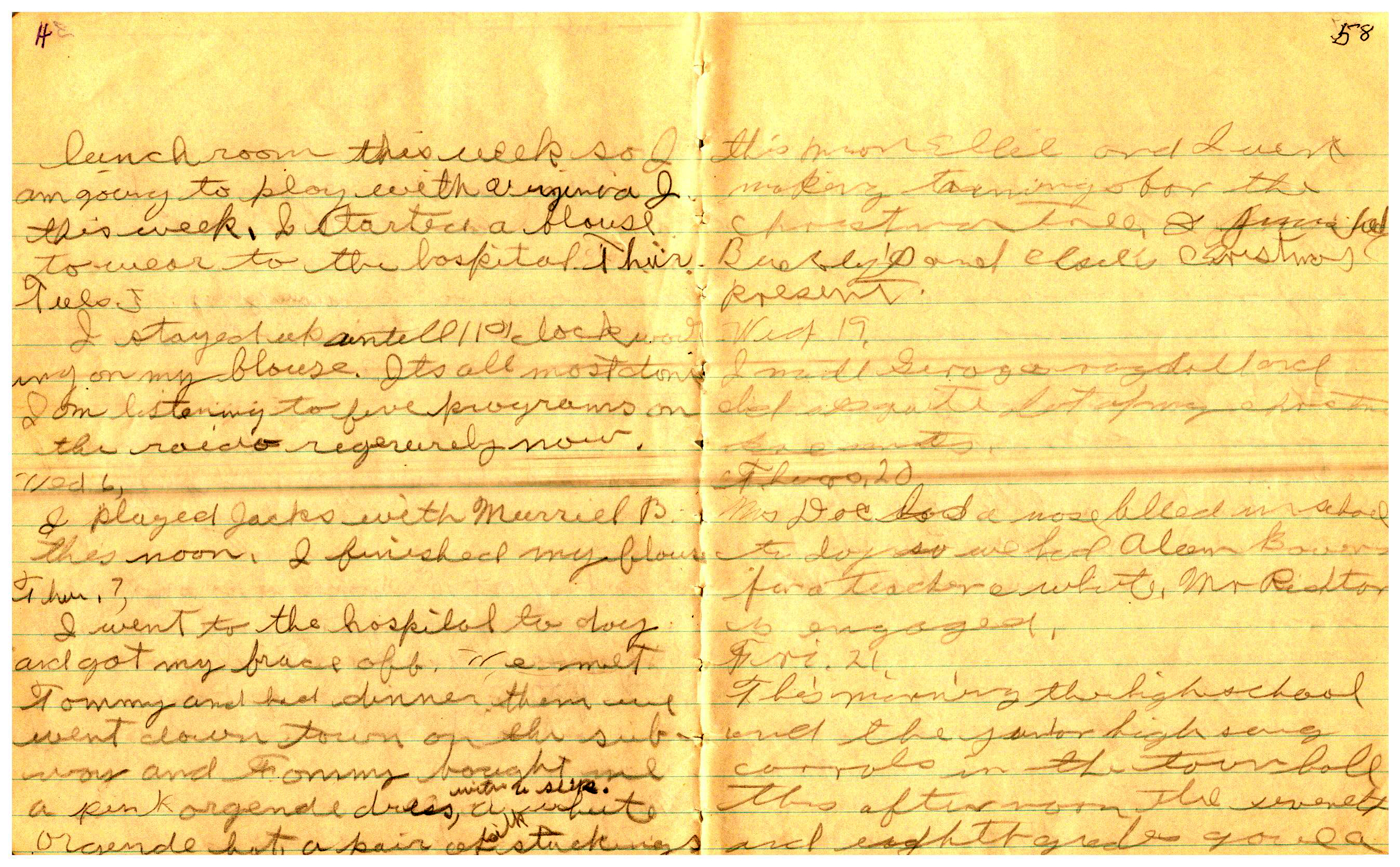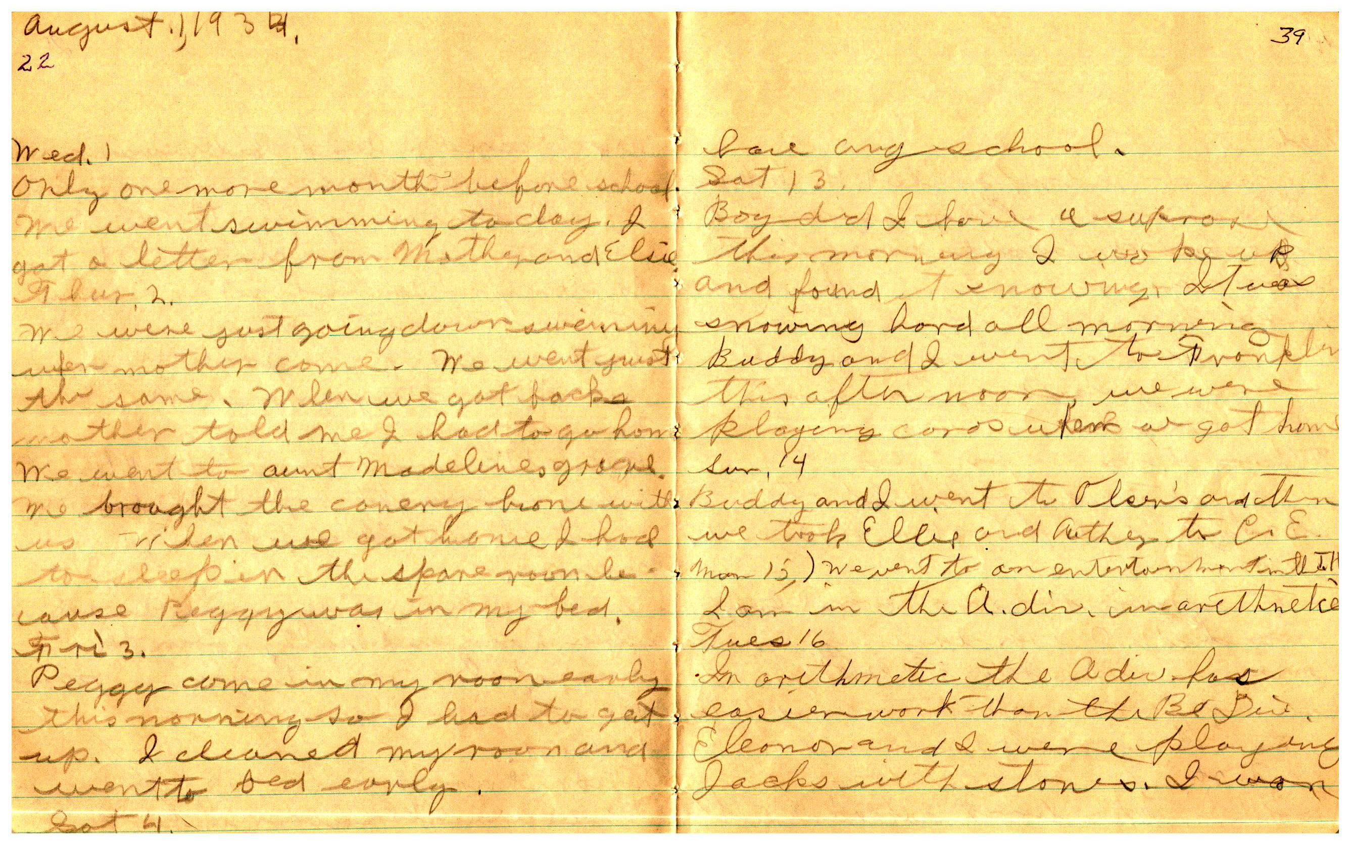WRENTHAM—Doris Brown, born June 17, 1921, kept a diary Friday, May 25, 1934 to Thursday, December 27, 1934. The diary has been scanned and is below. You must read in a zig-zag pattern following the page numbers. It is hope her entries will be useful at clarifying events in the Brown Family and identifying people she knew in Wrentham, MA.