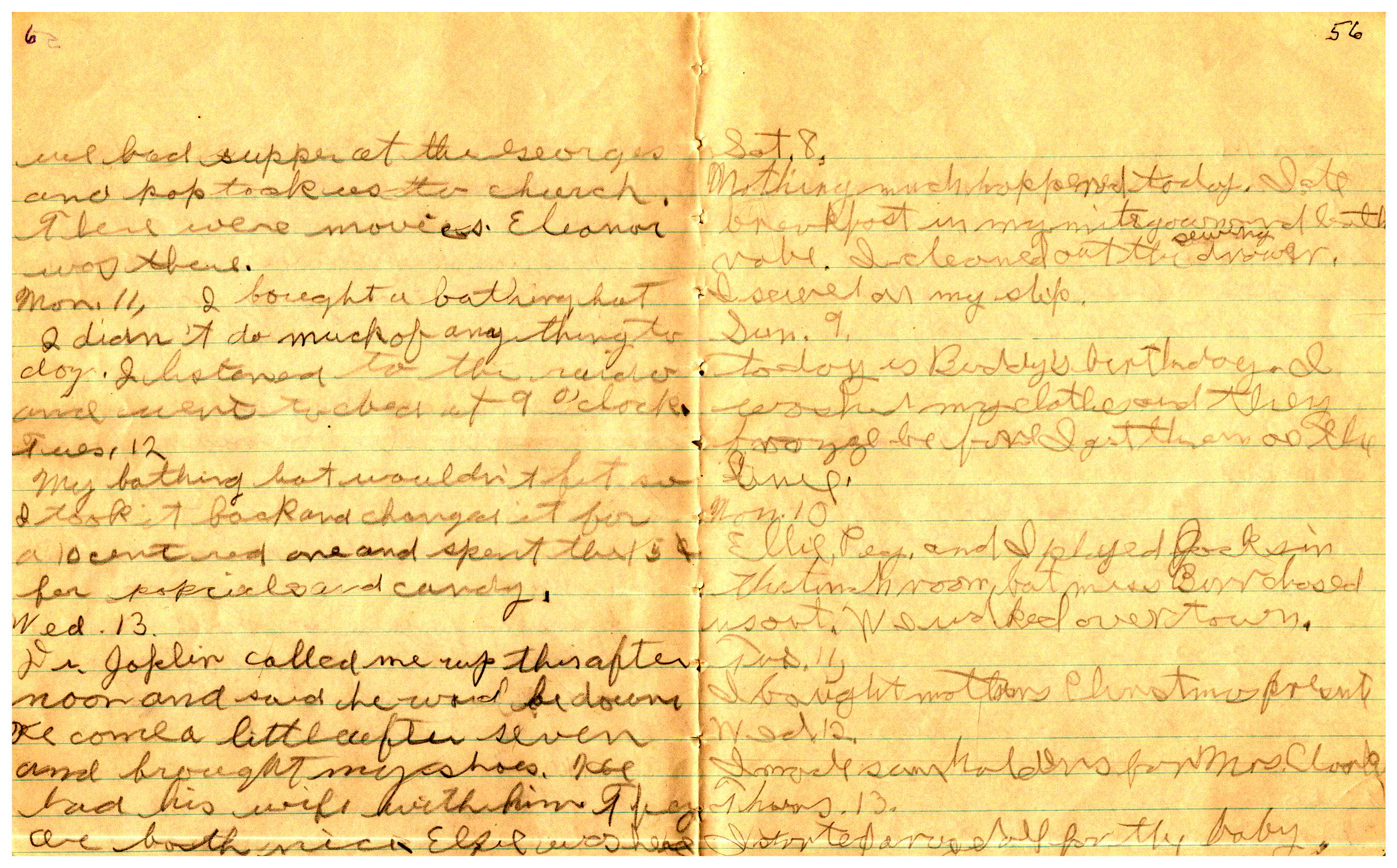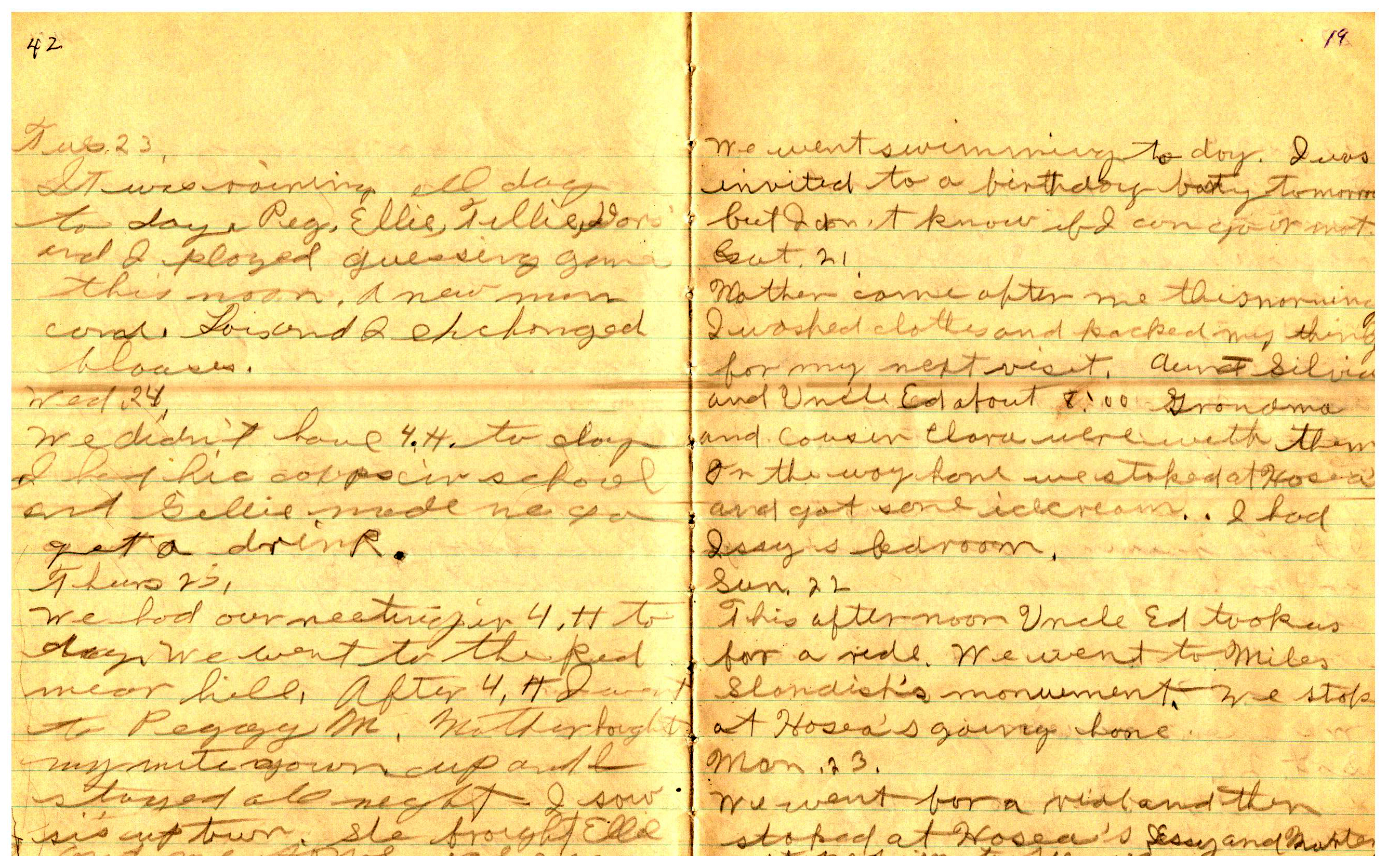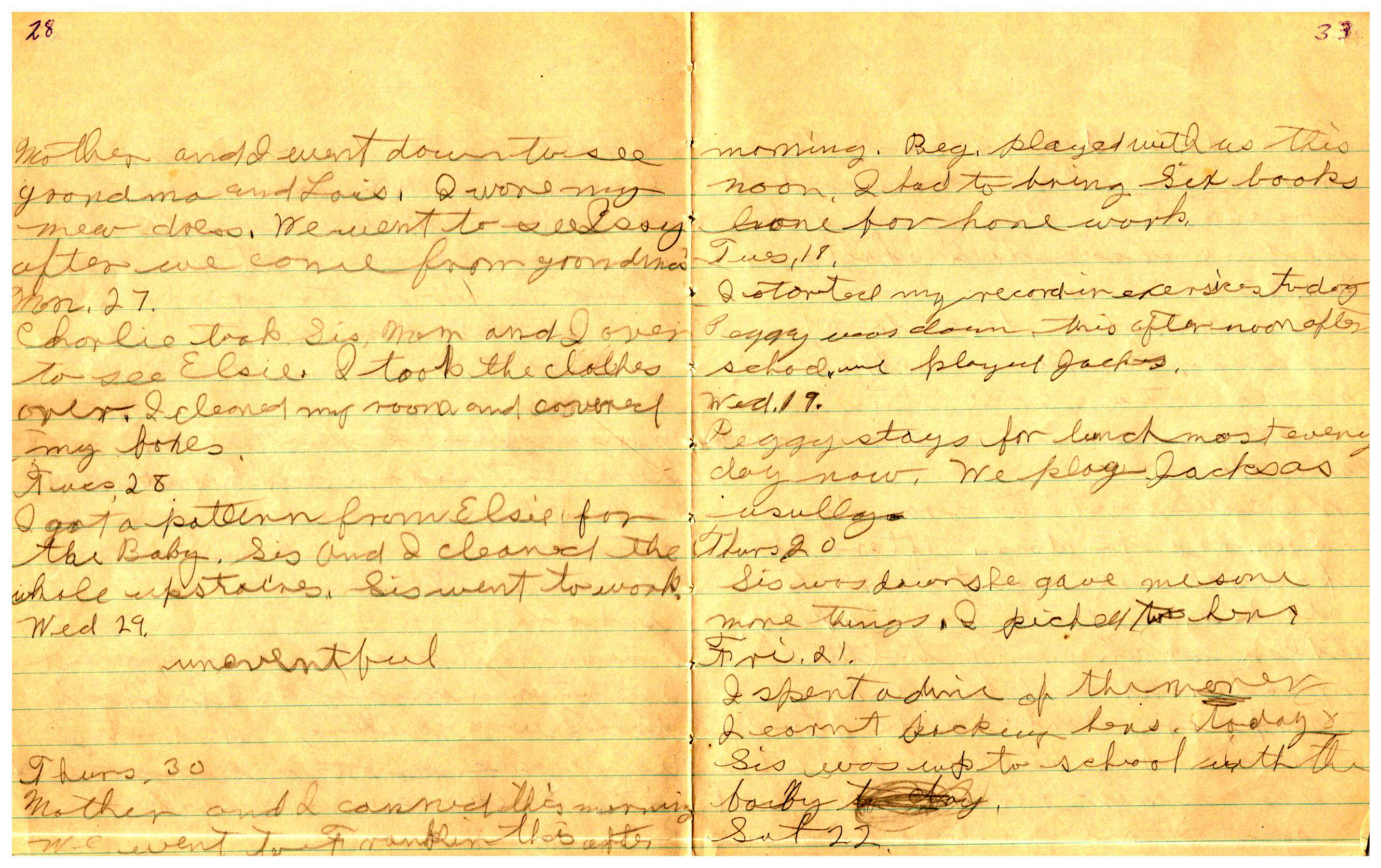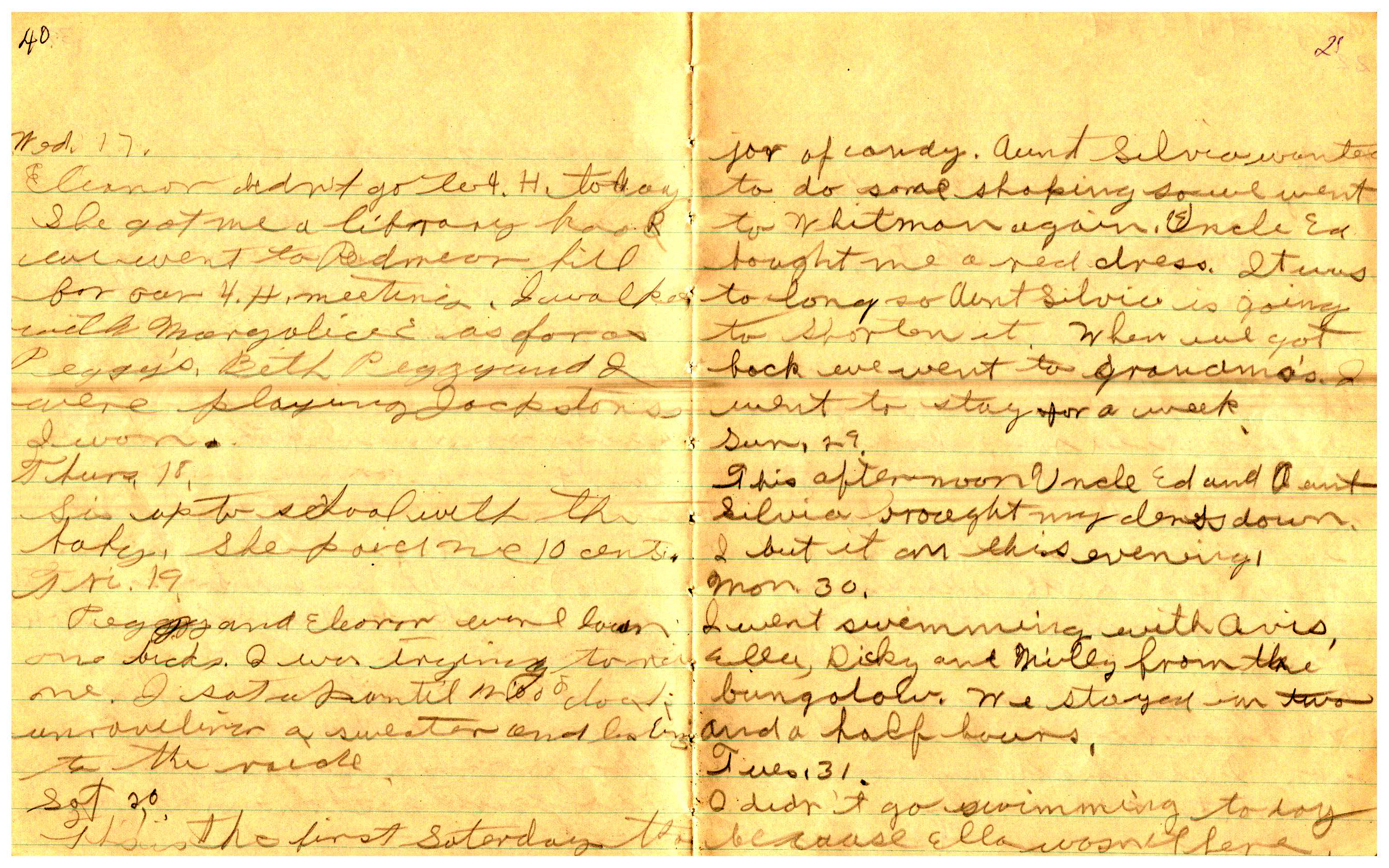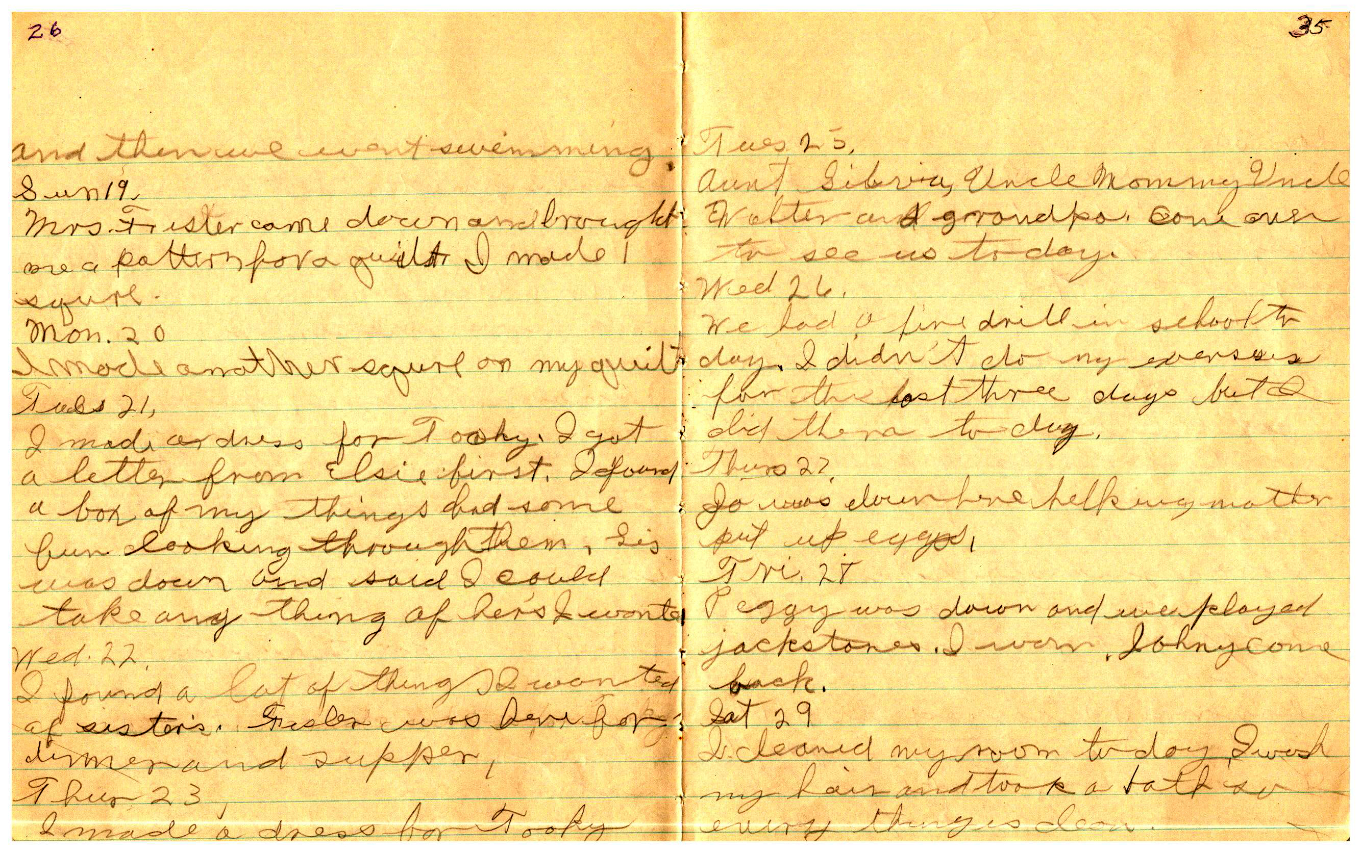 WRENTHAM—Doris Brown, born June 17, 1921, kept a diary Friday, May 25, 1934 to Thursday, December 27, 1934. The diary has been scanned and is below. You must read in a zig-zag pattern following the page numbers. It is hope her entries will be useful at clarifying events in the Brown Family and identifying people she knew in Wrentham, MA.