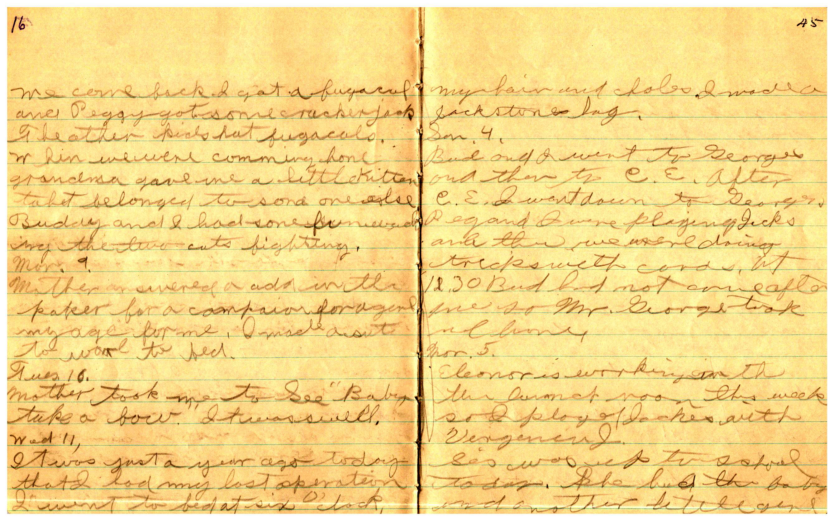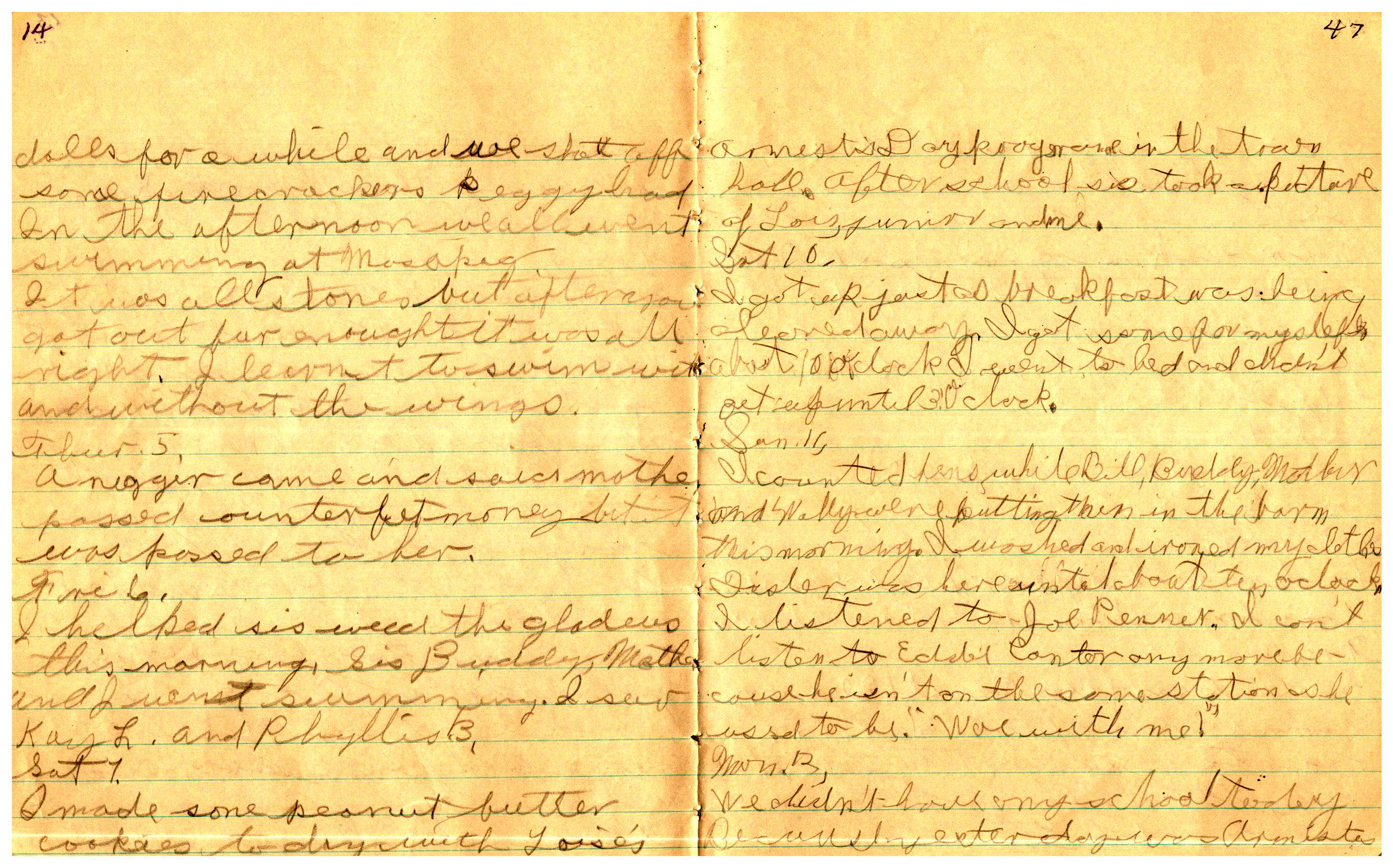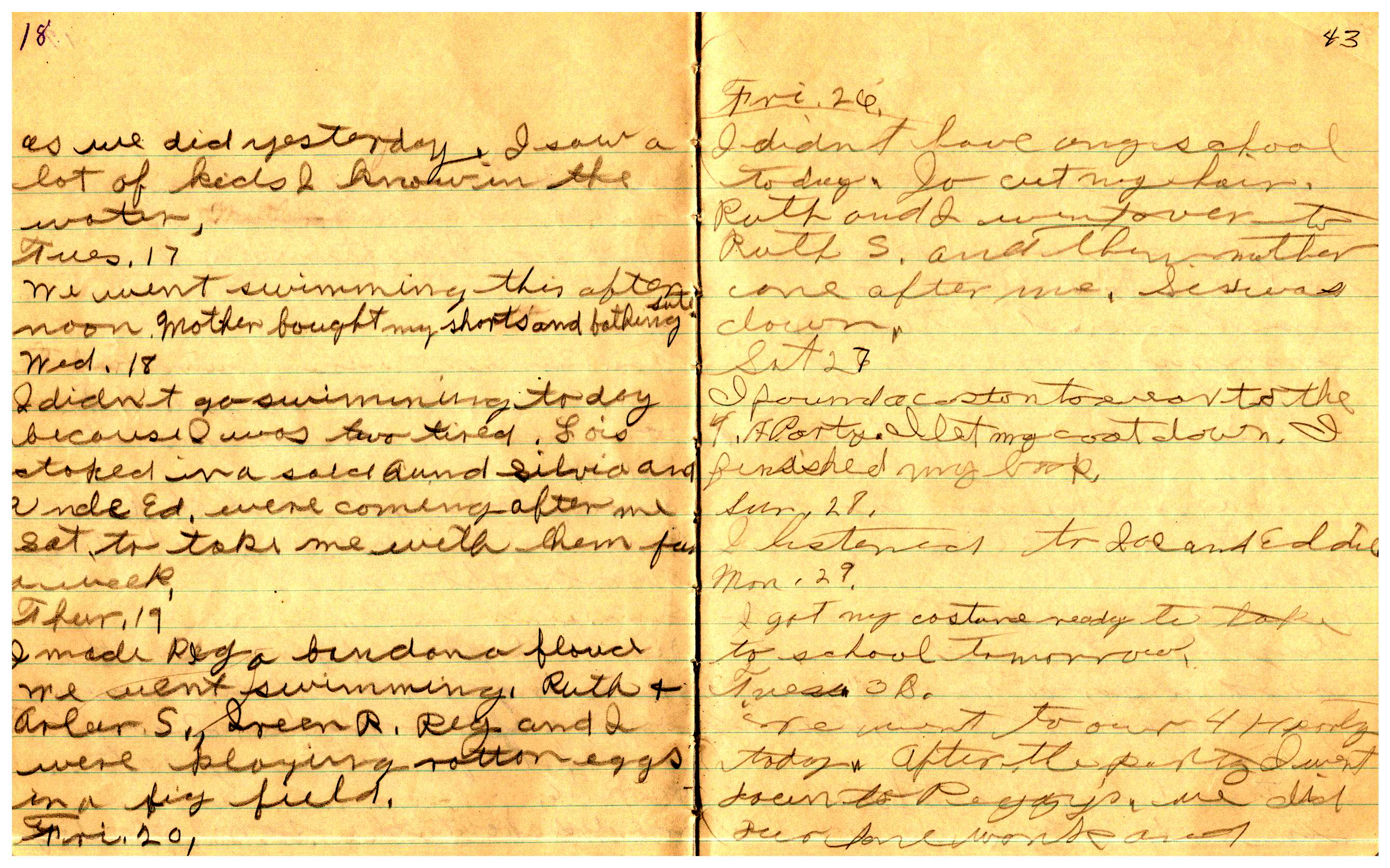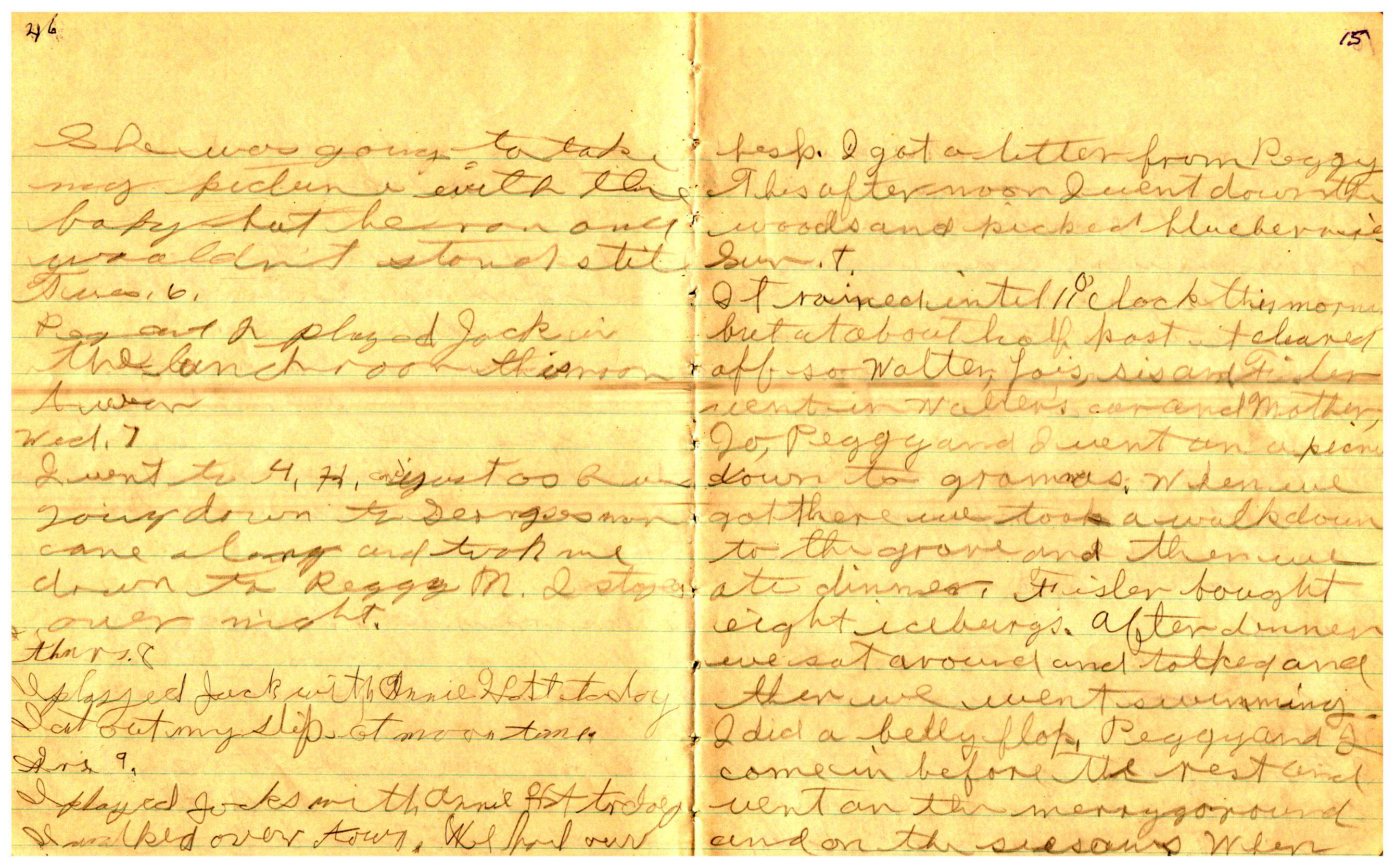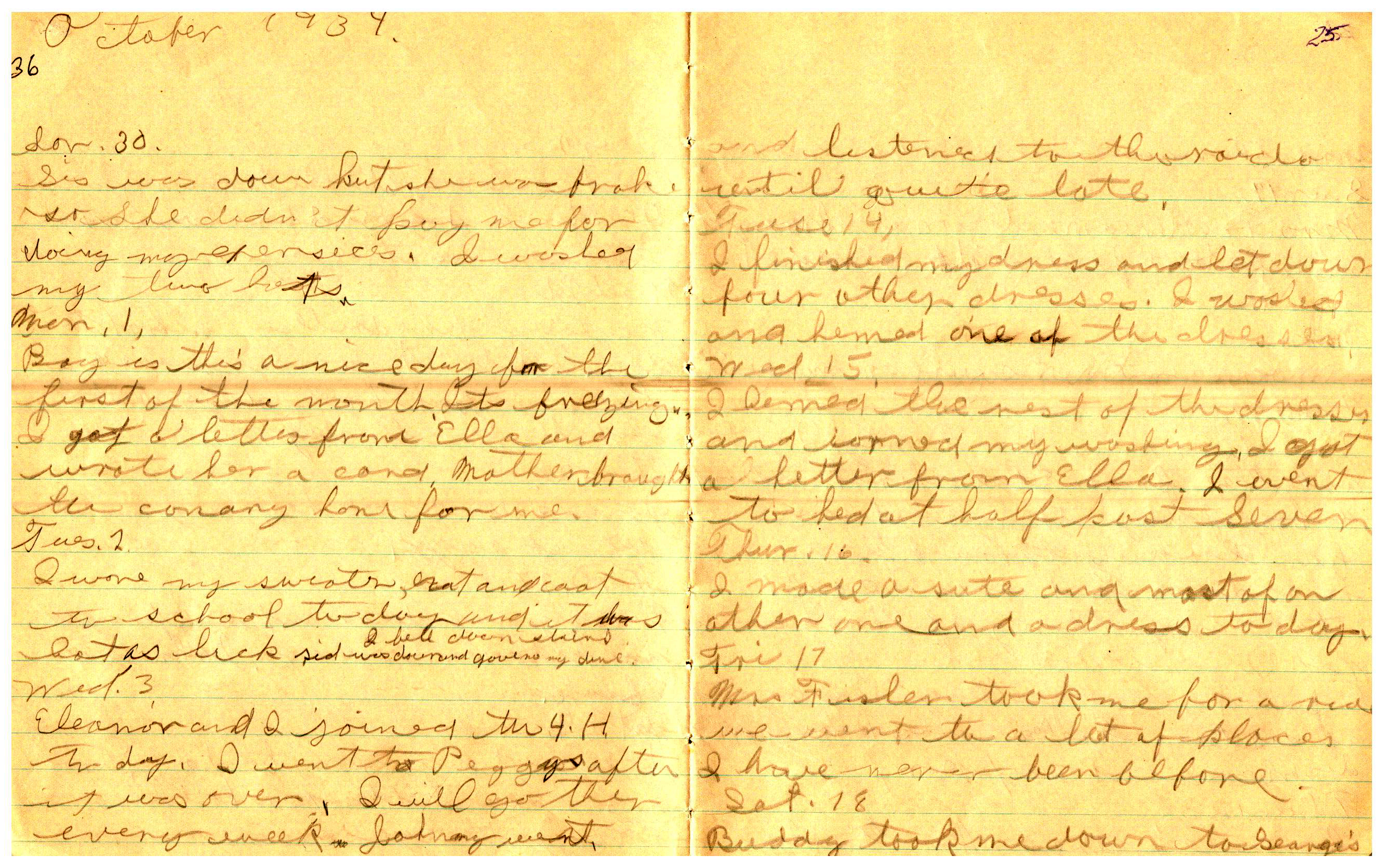 WRENTHAM—Doris Brown, born June 17, 1921, kept a diary Friday, May 25, 1934 to Thursday, December 27, 1934. The diary has been scanned and is below. You must read in a zig-zag pattern following the page numbers. It is hope her entries will be useful at clarifying events in the Brown Family and identifying people she knew in Wrentham, MA.