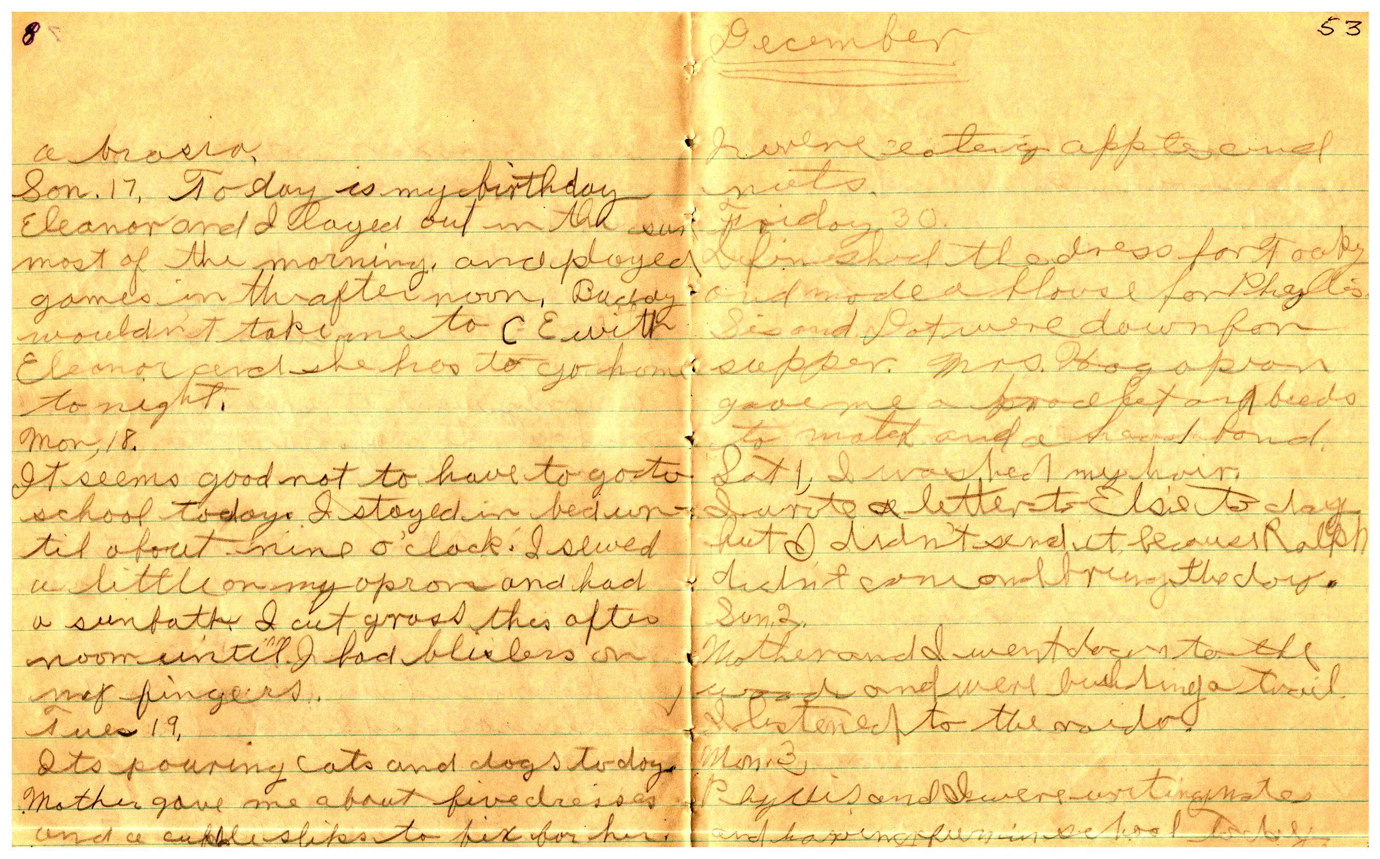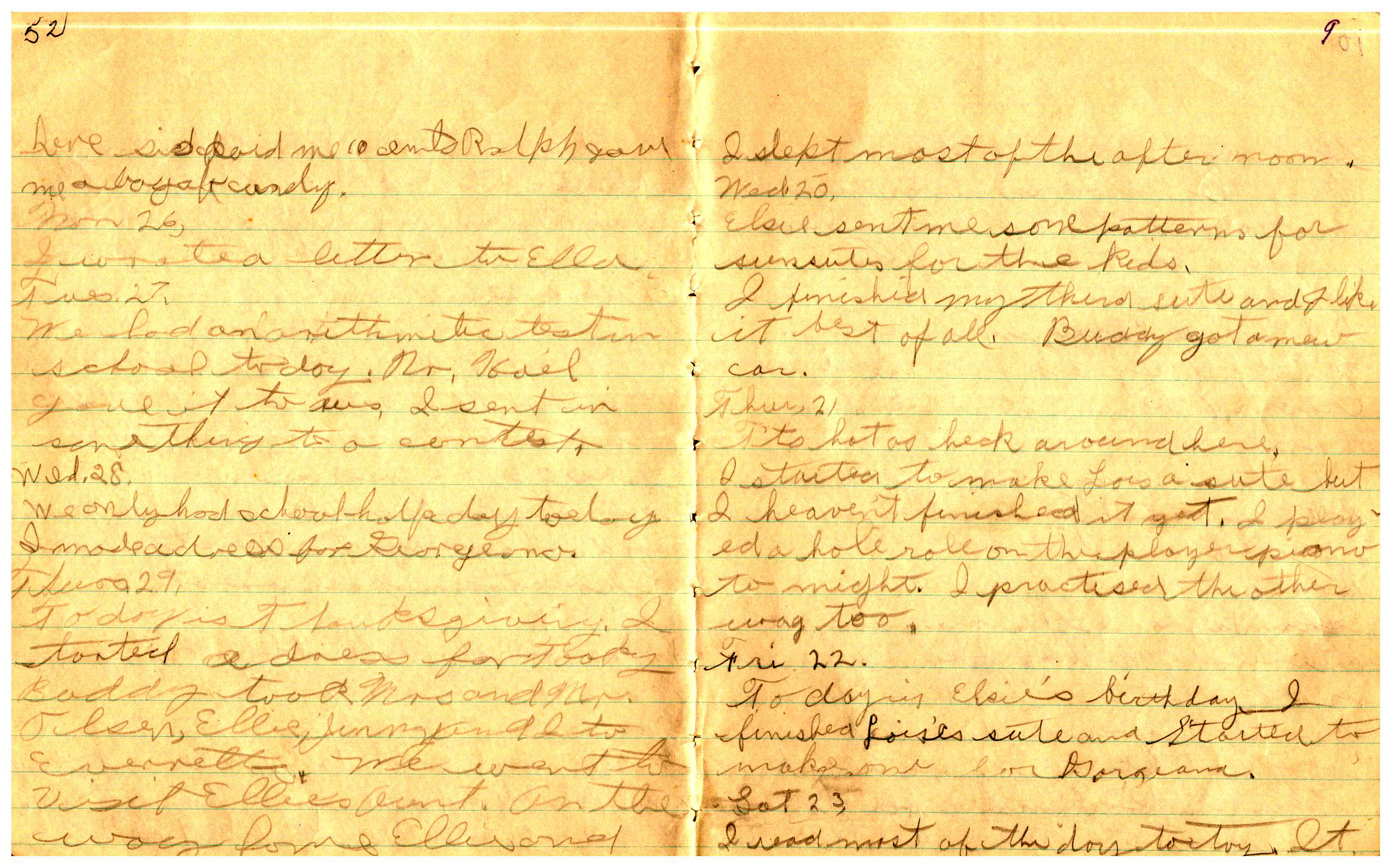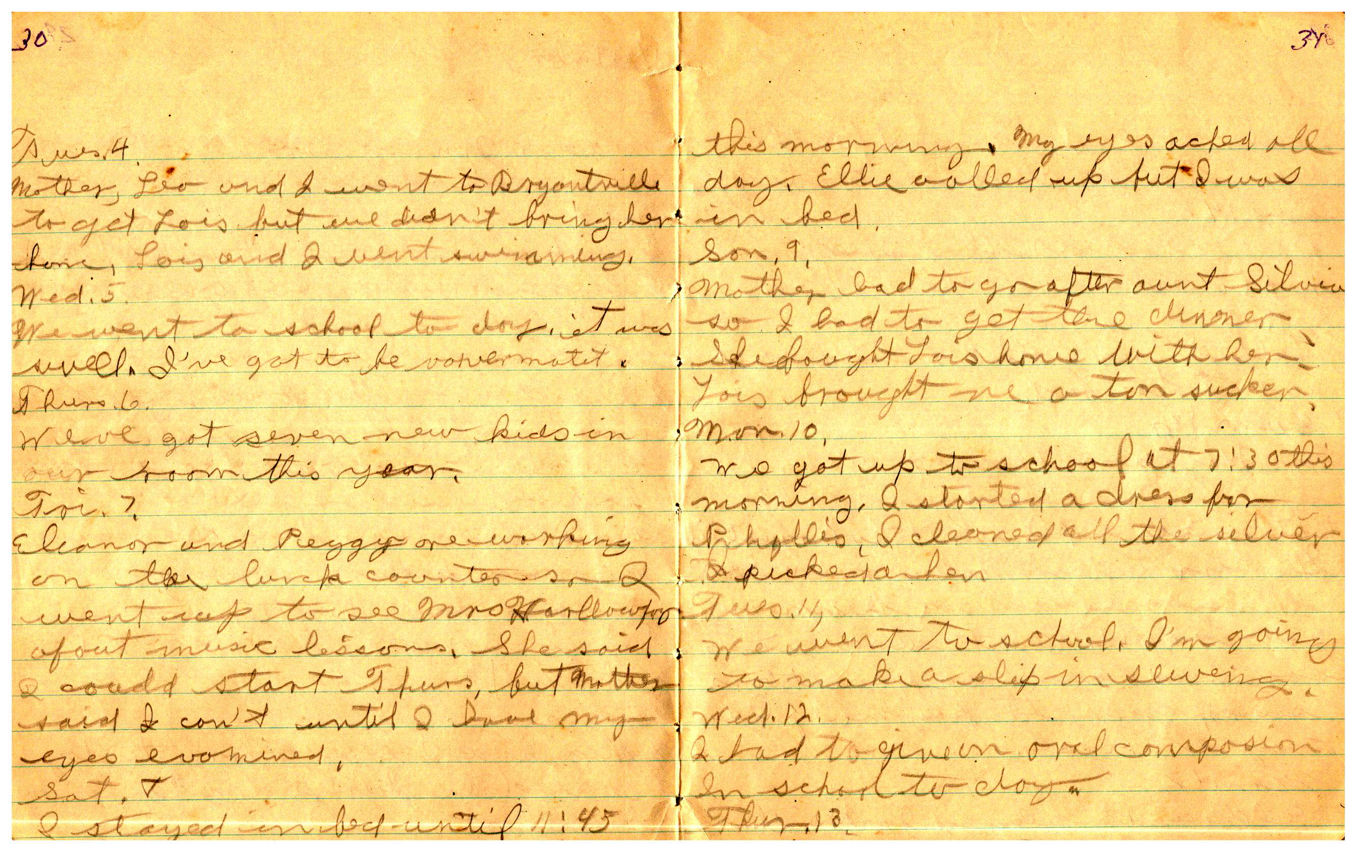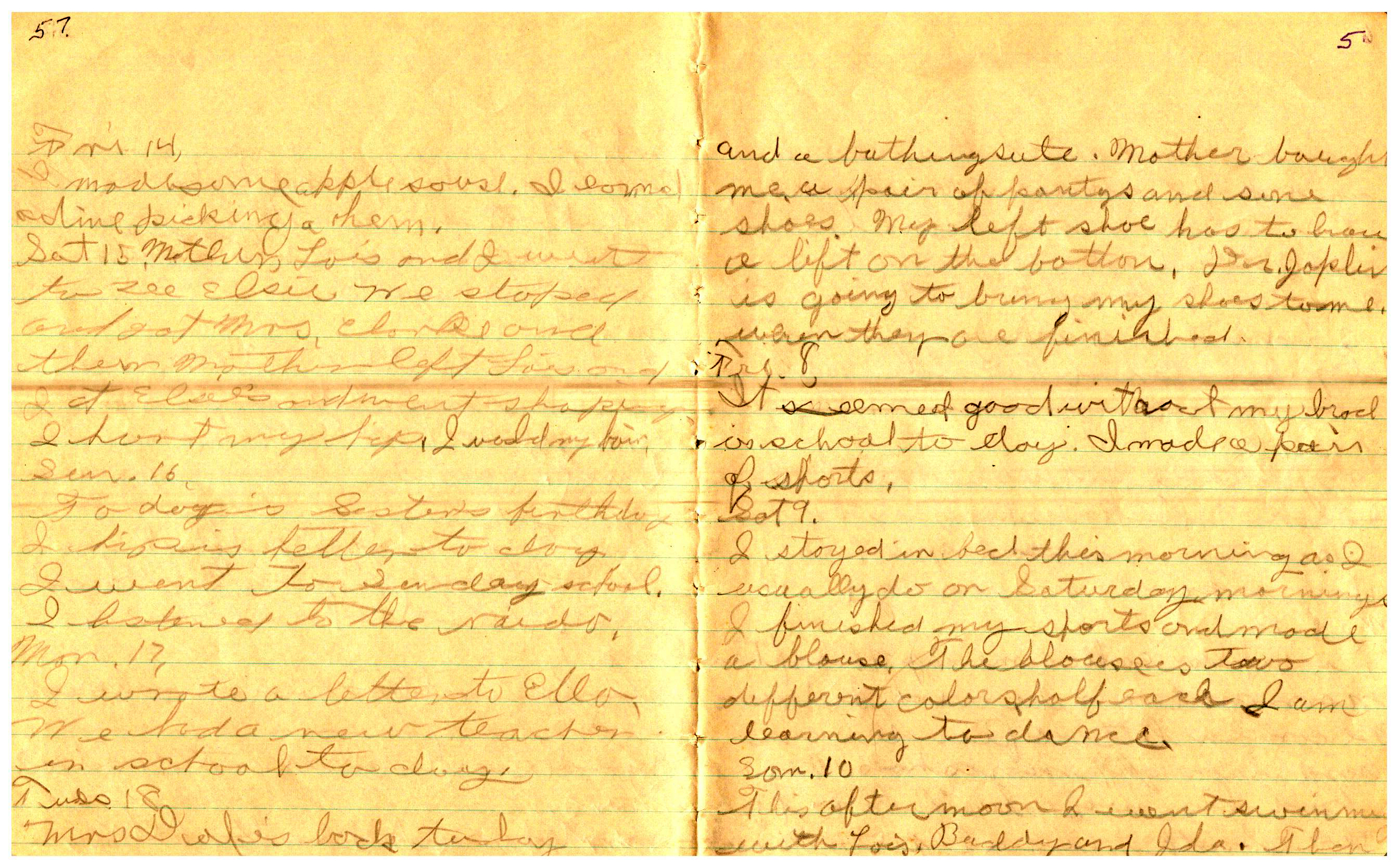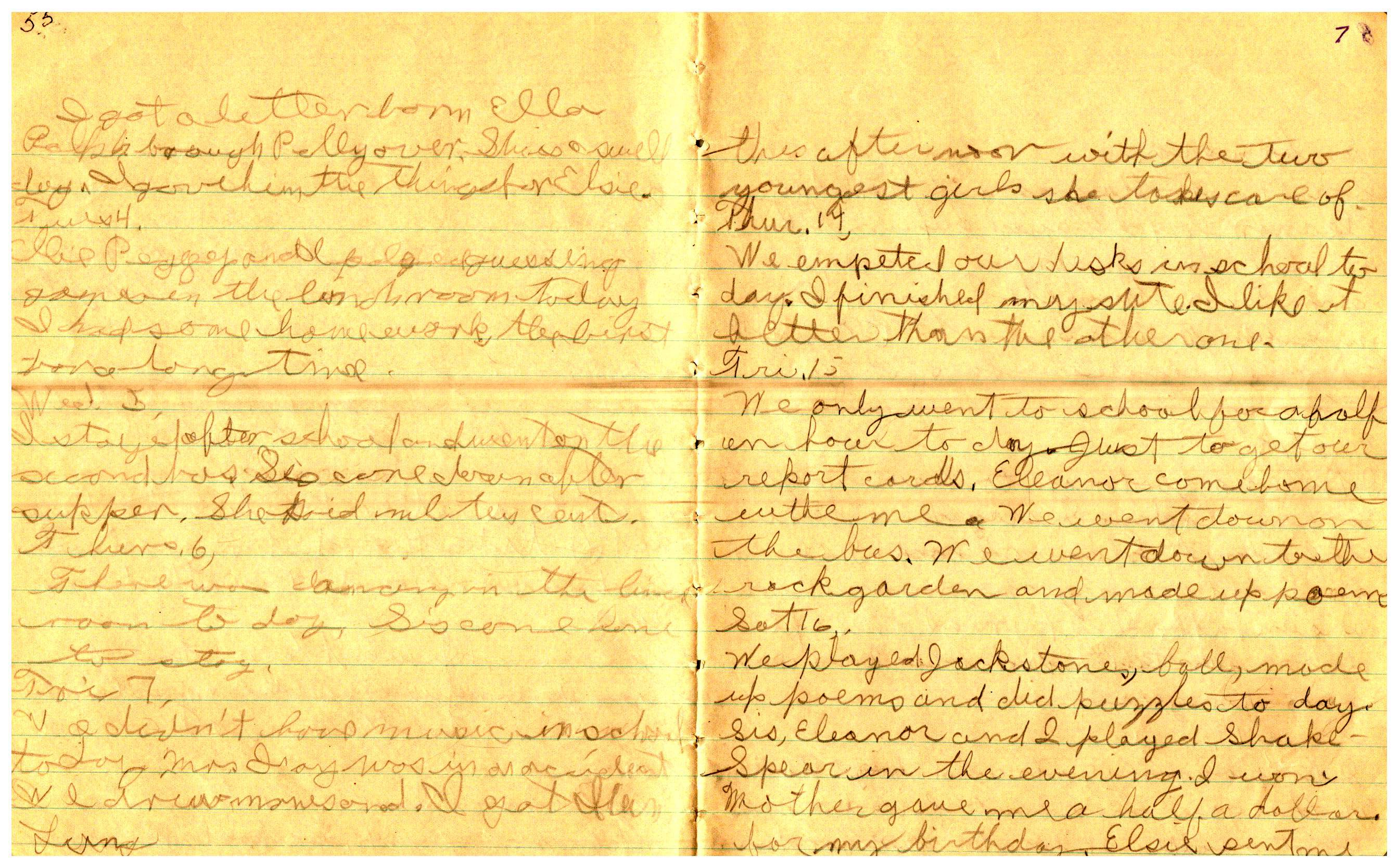 WRENTHAM—Doris Brown, born June 17, 1921, kept a diary Friday, May 25, 1934 to Thursday, December 27, 1934. The diary has been scanned and is below. You must read in a zig-zag pattern following the page numbers. It is hope her entries will be useful at clarifying events in the Brown Family and identifying people she knew in Wrentham, MA.
