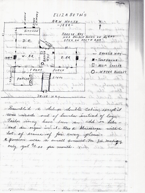 Elizabeth was granted a pension in 1887 and had a new house built in 1888. A stone in one of the chimneys bore that date. The railroad came through her property; that probably helped more than the pension. She now had a way to travel to Waco and other places. Elizabeth visited her daughter, Mollie, at Ozona in the 1890's. While there, she met a man who had been in the Dove Creek Battle with Captain Barnes.