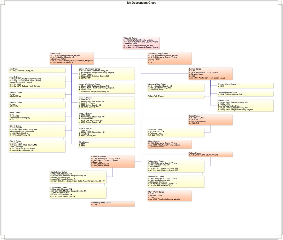 Charles H. Oakes was the son of William H. Oakes (1753-1818) and Elizabeth Elliott (1754-1841). Both parents were born in King William County, Virginia. William and Elizabeth had 9 children. Charles moved to Tennessee where he married Susan Neal in 1922. In about 1845, they came to Texas with their children Elizabeth Ann (1825-99), Fredonia (1827-48), William E.(1829-68), Robert Allan (1831-1923), Mary (1833-70), America (1835-), Sarah (1839-85), Charles Houston (1840-), Francis Marion (1845-69) and Milton Jackson (1845-?).