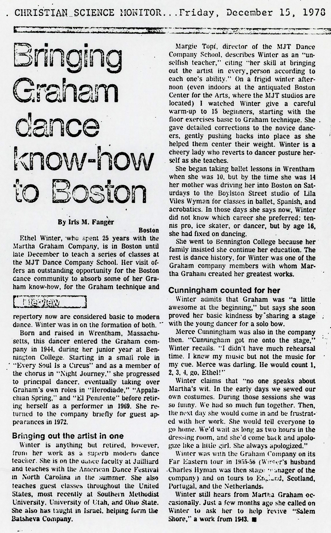 In 1943, when the Graham company was resident at Bennington, Ms. Winter performed with it as a student. She interned at the Graham school in New York in her senior year and graduated from Bennington after making an official debut with the company in its 1945 Broadway season. In 1948, according to a biographical essay by the dance scholar Victoria Phillips Geduld, Ms. Winter became ill with tuberculosis. After a year of bed rest, she returned to Vermont to teach at Bennington and work toward a master’s degree. There she met Charles Hyman, who taught stage design and lighting in the theater arts department and who was later the Graham troupe’s stage manager. They were married in 1950. Mr. Hyman died three years ago. Ms. Winter is survived by their son, David. Ms. Winter suffered a relapse of tuberculosis and decided not to tour for a period in the 1950s, Ms. Geduld said. Instead, she danced in the companies of the Graham dancers Sophie Maslow and Anna Sokolow in New York and performed in a Broadway show, “Ankles Aweigh,” in 1955. Ms. Winter then returned to the Graham troupe and, from 1962 to 1969, toured with her own small group. Although she was not primarily interested in choreography, “En Dolor,” the Spanish-tinged student solo she created at 19, became a modern-dance classic. It will be performed this spring in New York and Seattle. Correction: March 19, 2012
