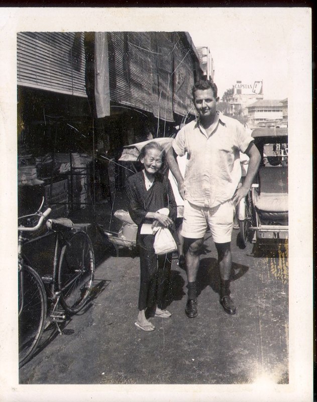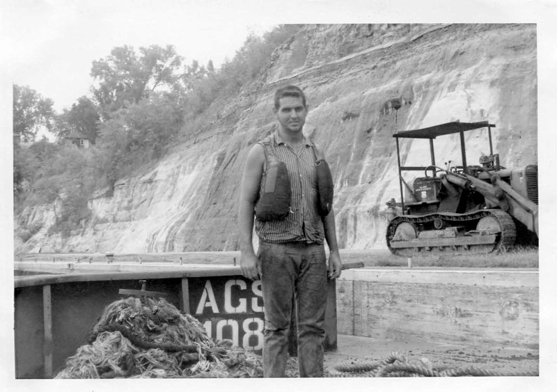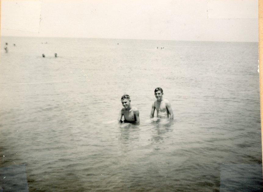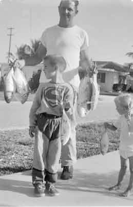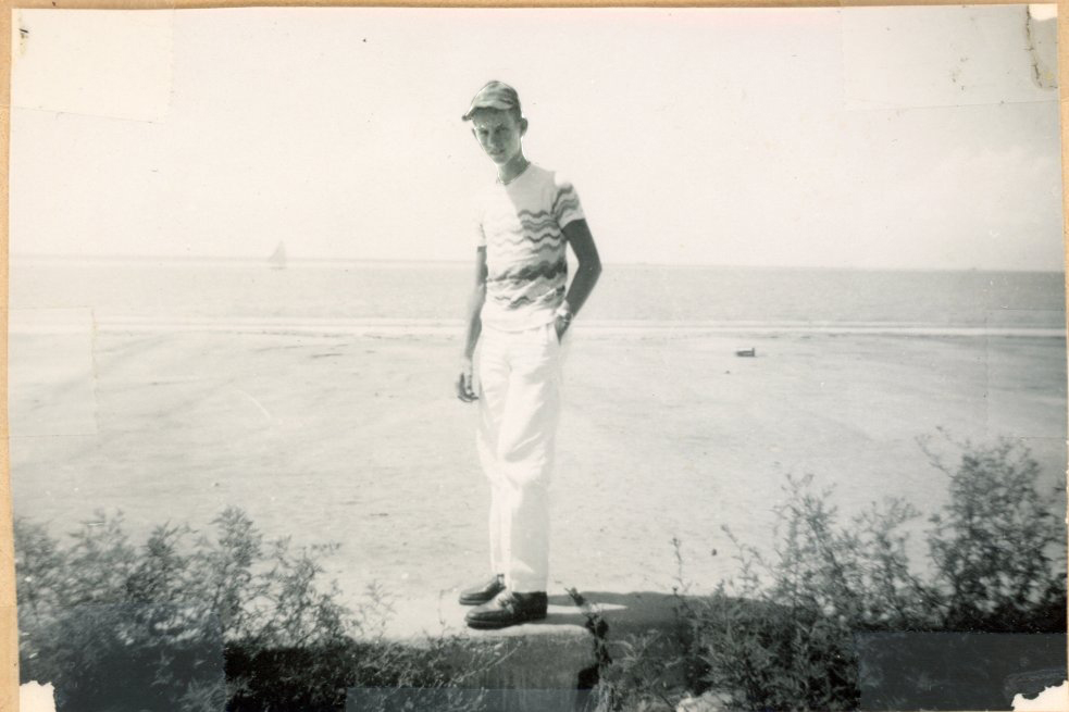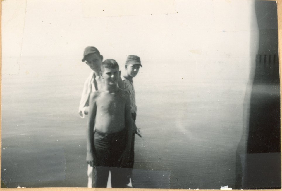 John Christian Oakes in white shirt on Dolly King’s boat. Family friend Fred Harris in the background, second from left.