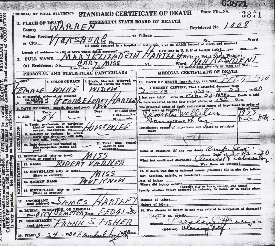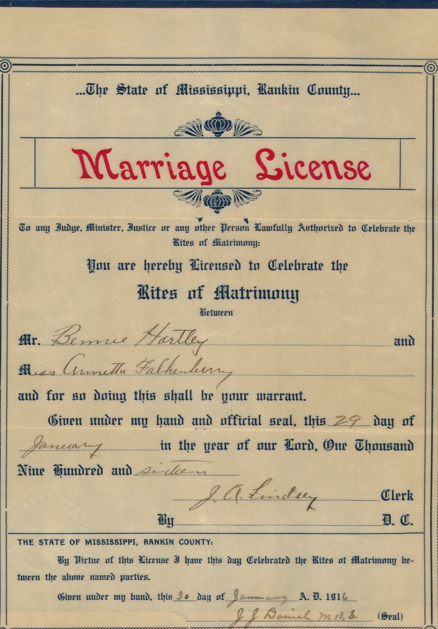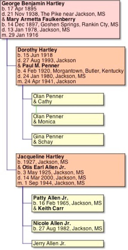 George Benjamin Hartley was born April 11, 1895 to George Leroy and Mary Elizabeth Varner Hartley in Flora, MS. His siblings included, Alma Lee, Leila Mae, Samuel Richard, Edward Lee, Margie Louise, James Russell, Marvin Ashley and Rudolf (still born). He married Mary Armetta Faulkenberry on January 29, 1916. Benny was 21 and Mary Armetta was 19. Mary Armetta Faulkenberry was born December 14, 1897 in Goshen Springs, Rankin County, MS.. Their children were Dorothy Hartley (Penner) and Jacquelin Hartley (Allen). George Benjamin died in November 21, 1938 at the age of 43. Mary Armetta died January 13, 1978 in Jackson, MS.