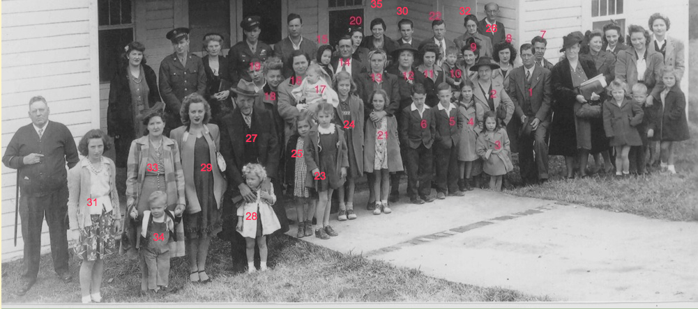 2 Leila Mae Conrad 3 Eula Mae Stephenson 4 Agnes Conrad 5 Rufus Stephenson 6 Kenny Stephenson 7 George Conrad 8 (Leila) Mae Conrad 9 Louise Conrad Stephenson 10 Alton Ray Stephenson 11 Betty Conrad 12 Mrs. Stephenson 13 Mrs. Henley 14 Mr. Henley 15 Henley Child 16 Pauline Sharp 17 Donnie Sharp 18 Mildred Sharp 19 Billy Sharp 20 Jean Matthews 21 Barbara Henley 22 Albert McMullen 23 Dixie Sharp 24 Edith Sharp 25 Barbara Sharp 26 Brother Guy 27 Juggles Allison 28 Billie Ruth Allison 29 Thelma Muirhead 30 Ralph Webster 31 Nellie Jean Huggins 32 Mrs. Guy 33 Mrs. Nell Allison 34 Lendle Allison 35 Alma Lee Hartley Matthews |