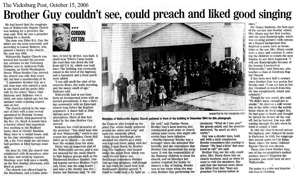 The Waltersville Baptist Church started in the summer of 1933 with a tent revival sponsored by Bowmar Avenue Baptist Church, then pastored by Rev. J L. Boyd. A month later, a Sunday school was organized, first meeting in the Wadford home, then at Givens’ Machine Shop, later in a vacant house, and by the time attendance reached 100, a Mr. Ford made the old dance hall pavilion at Mont Springs available. On June 24, 1934, the church was established with 16 members, nine by letter and seven by baptism. Meetings were held once a month, on the first Sunday afternoon, with Boyd as pastor. The church was offered land by the Meachams, and a frame structure, 44 feet by 20 feet, was built. It stood near Toler’s Camp beside the road that was down the hill from old U. S. 61, which was built later. The building was eventually raised to the level of the highway and a basement and front porch were added. Which Wadford was this? |