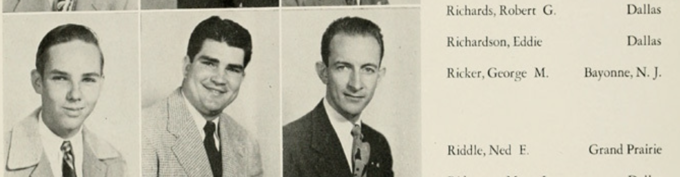 George Marvin Ricker was born in Boston, lived as a child in New Hampshire, matured as a teenager in Auburn, New York, where he graduated high school. He served in World War II in the Army Air Corps and was discharged after the war as a Captain. He enrolled in SMU and graduated with Honors in 1949. While at SMU, he lettered for two years on the tennis team. He was elected to several honor societies, one of which became SMU’s Phi Beta Cappa chapter. In his sophomore year, he married Frances Ryden to form a compatible and loving relationship that continued for over 72 years. Who proceeded him in death in2020.