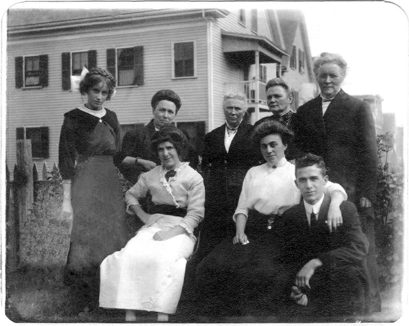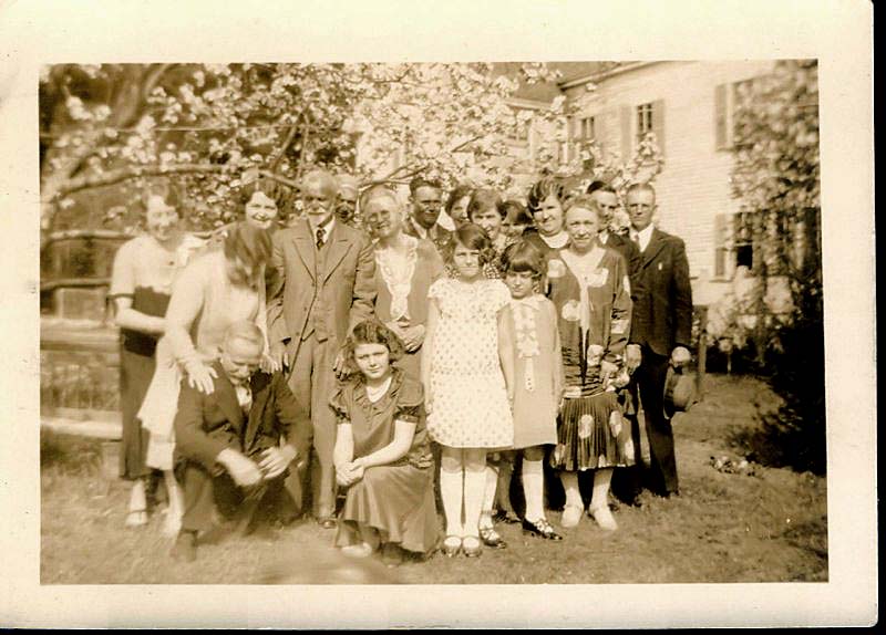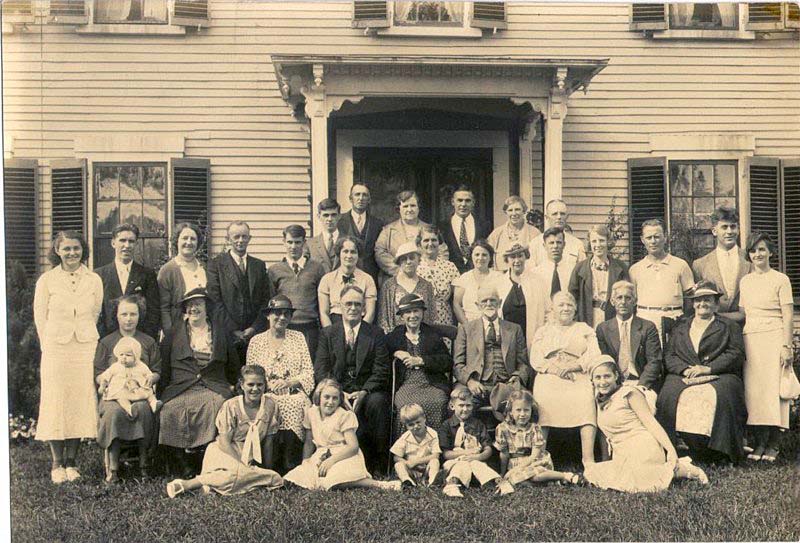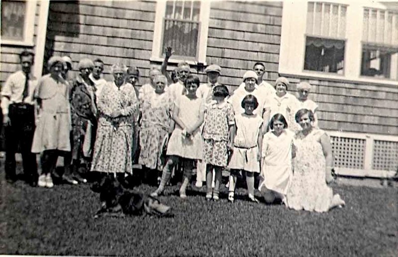 Ruby Brown hosted a reunion of her family at Sunny Acres Farm in Wrentham, MA where she raised chickens and prize-winning gladiolus bulbs. Lois Brown is on the far left, Bud Brown is in the back by the left hand porch pole, Frank ?, Charles Gordon & Margaret E. Follansbee, then Ed Benson standing by the right hand pole, Ruby Brown is in the almost back row in the middle(polka dot dress), her father Levi is seated fourth from the right, Doris Brown is on the grass in the front right. Alice and Ralph Brewer are standing 3rd and 4th from the left, Alton and Ruth Howe Shurtleff 5th & 6th and Maude Shaw 7th. Small boy in front could be George Shurtleff, son of Ruth. Other Bensons, Browns, Griffins, Shaws, and Follansbees were there. |