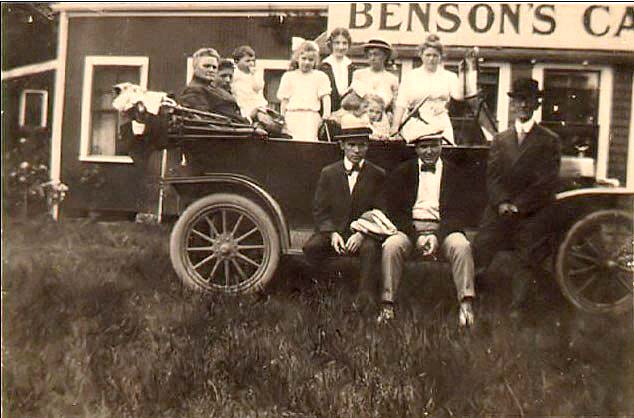 Back left: Alvina and Levi Benson, Edmund, ? w/dog #3rd Row: ? M, ? W, ? M, ? M, ? Tom Shaw, ? Merle? 2nd Row: ? W, ? W, ? W, ? W, ? W Front: Ruby, Sylvia and Norman Benson. Thomas Shaw and Merle Benson are seated on the right middle, Madeline and Effie? are seated between Ruby and Sylvia |