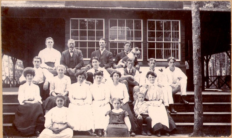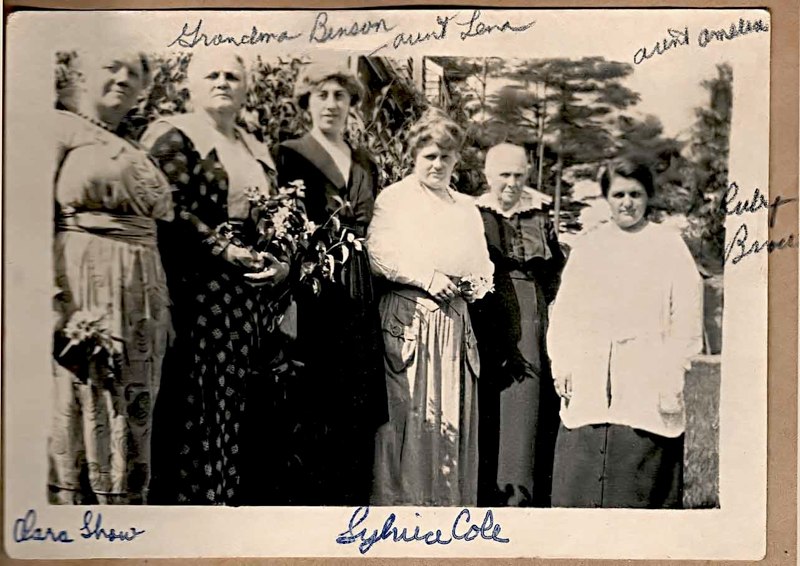 Front: Kneeling: ?, Elsie Brown, Standing Lois & Doris Brown, ? 2nd Row: Madeline, Levi & Alvina Benson, Lena Benson,?,? Back: ?, Sylvia, Tom(?), Ed. ?, Florence(?), ?, ?, Merle |
