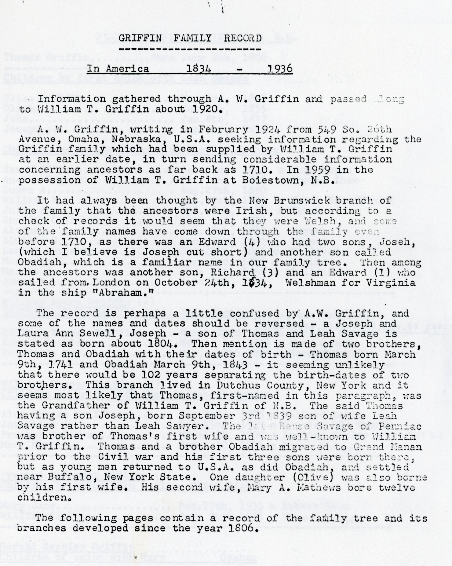 A. W. Griffin, writing in February 1924 from 549 So. 26th Avenue, Omaha, Nebraska, U.S.A. seeking information regarding the Griffin family which had been supplied by William T. Griffin at an earlier date, in turn sending considerable information concerning ancestors as far back as 1710. In 1959 in the possession of William T. Griffin at Boiestown, N.B.