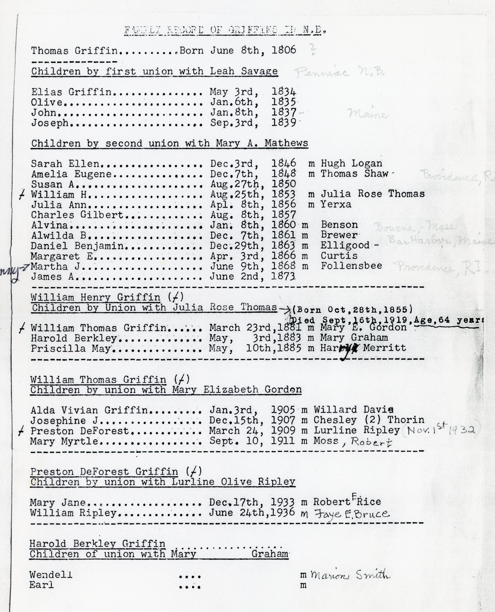 The record is perhaps a little confused by A. W. Griffin, and some of the names and dates should be reversed - a Joseph and Laura Ann Sewell, Joseph - a son of Thomas and Leah Savage is stated as born about 1804. Then mention is made of two brothers, Thomas and Obadiah with their dates of birth - Thomas born March 9th, 1741 and Obadiah March 9th, 1843 - it seeming unlikely that there would be 102 years separating the birth-dates of two brothers. This branch lived in Dutchus County, New York and it seems most likely that Thomas, first-named in this paragraph, was the Grandfather of William T. Griffin of N.B. They said Thomas having a son Joseph, born September 3rd 1839 son of wife Leah Savage rather than Leah Sawyer. The late Rense Savage of Penniac was brother of Thomas's first wife and was well-known to William W. Griffin. Thomas and a brother Obadiah migrated to Grand Manan prior to the Civil War and his first three sons were born there, but as young men return to U.S.A, as did Obadiah and settled near Buffalo, New York State. One daughter (Olive) was also borne by his first wife. His second wife, Mary A. Mathews bore twelve children.