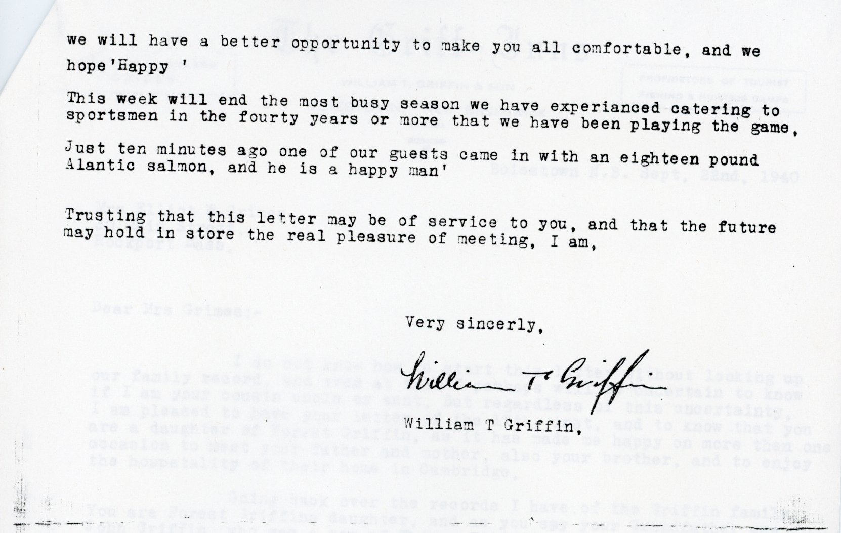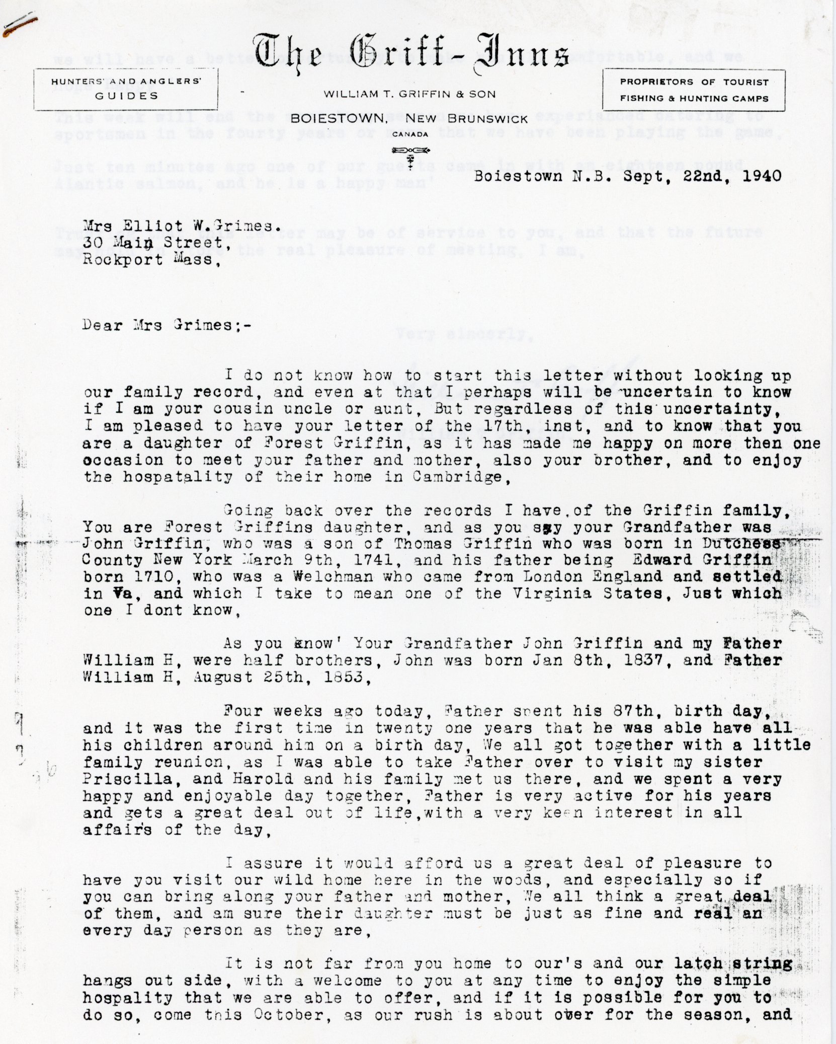 1940 Letter from William T. Griffin to Mrs. Elliot Grimes, a relative. |