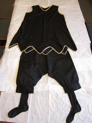 When the railroad sold the land, the boathouse had to be tom down, but Elsie rescued her own suit and Helen's and kept them these many years. Helen's suit is in good condition. It has a black dress-like top with pointy hem-line trimmed with white bias tape, which was worn over big black bloomers. Elsie's suit, also donated, is a much-worn dark blue romper-like suit trimmed with braid, and a separate knee-length skirt goes over it. Black stockings, rubber bathing shoes, and a bouffant cap or scarf over the hair completed the costumes.