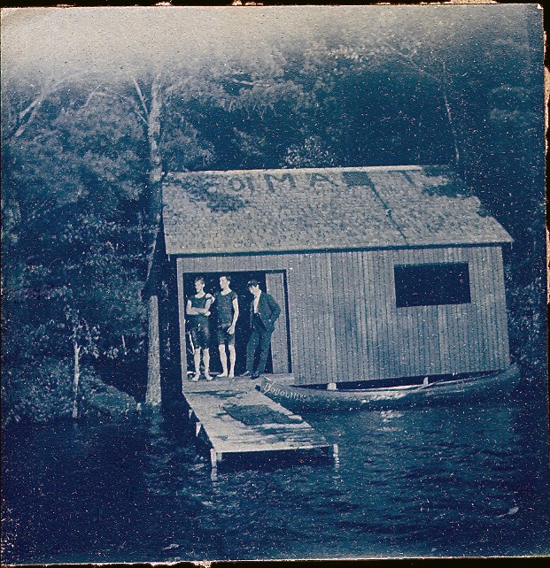 Helen Keller already knew and loved Wrentham and its lakes from summer trips to the Red Farm on Franklin St. But in 1904 when Helen bought the house on East St. and seven acres of land and moved to Wrentham, the east end of the lake was much closer. Elsie's older sister, Christina, seems to have been the one who first became acquainted with Anne Sullivan, Helen's teacher and companion. Chris invited Anne to bring Helen down to the boathouse. Since most of the young people worked all day, the boys soon gave Anne a key so the two ladies could come and go as they desired. For convenience Helen would leave her suit hanging in the boathouse, where it remained after they moved away from town in 1917. (L to R: Helen and Anne at right, photo from Wrentham Lions Club).