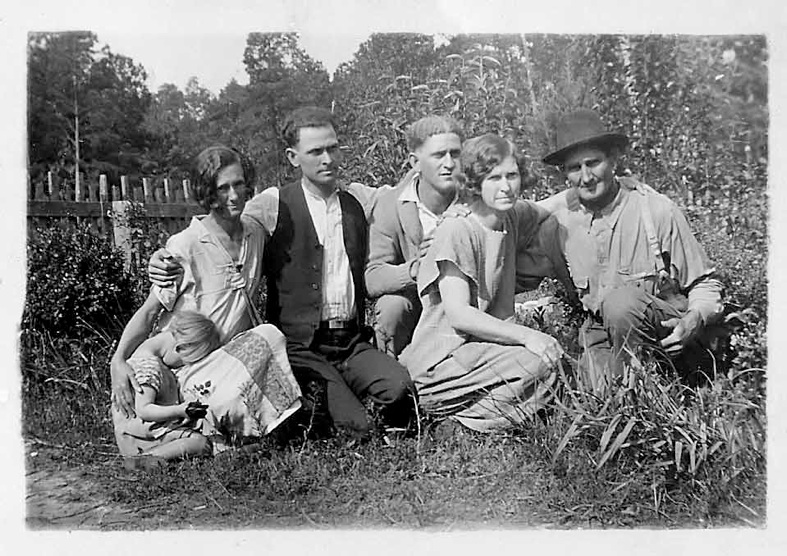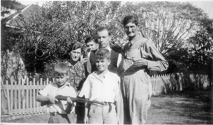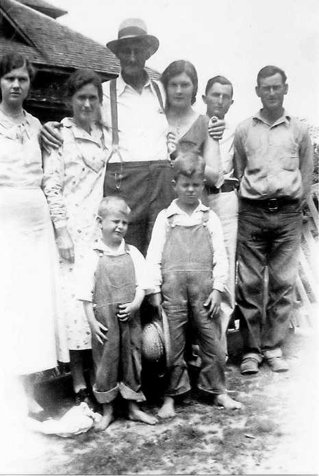 LtoR: Front: Boys: Kenneth Matthews, Harold Dean Hyman, Back: L to R: Zilla Mae Hyman, Mattie Kyser Hyman, Andrew M. Hyman, Hazel Hyman, Larkin Brumley (Zilla Mae’s boyfriend,) Charles Matthews(Edith Hyman’s husband). Picture made on Hyman farm in Banks, AR , |