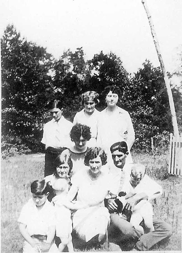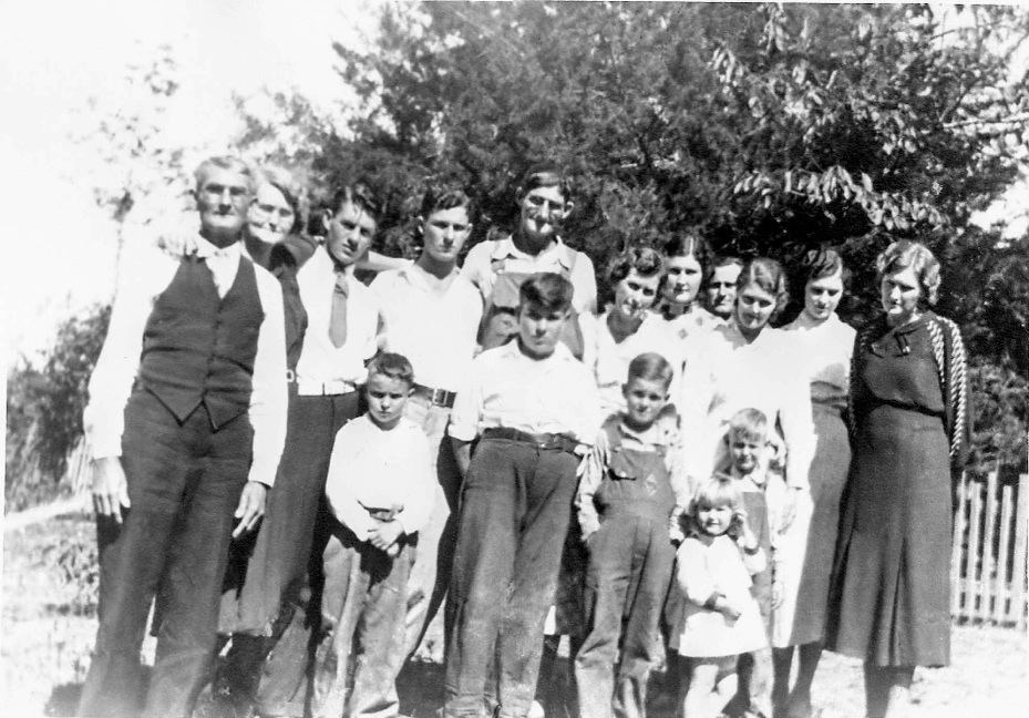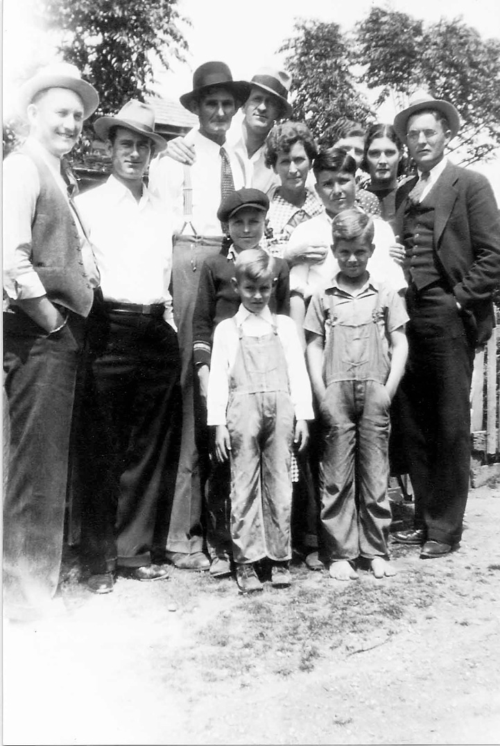 LtoR: Front: Boys: Kenneth Matthews Harold Dean Hyman, Back: Boys: Ned Stone, Leslie Hyman, Adults: L to R: Paul Doak Johnson, Charles Matthews, Andrew M. Hyman, John Kyser, Mattie Kyser Hyman, Zilla Mae Hyman Johnson, Hazel Hyman, Orie “Booch” Stone Picture made on Hyman farm in Banks, AR , June, 1934.(Paul Johnson and Zilla Hyman were married in May 1934.)