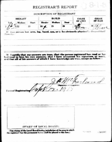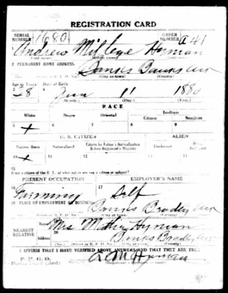 Andrew M. Hyman’s WWI Registration Card Sept. 12, 1918, Banks, Bradley, AR |