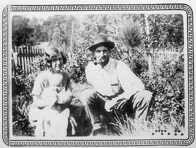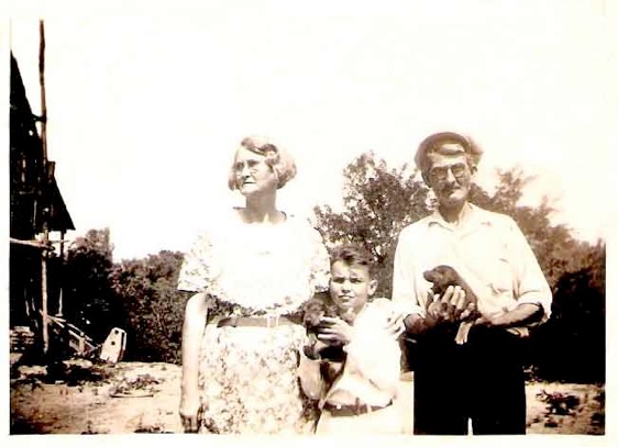 LtoR: Martha Geneva “Mattie” Kyser Hyman, Andrew M. Hyman, and their son Harold Dean Hyman taking his bottle in a pint whiskey bottle, ca 1925, Banks, AR(1843-90) |