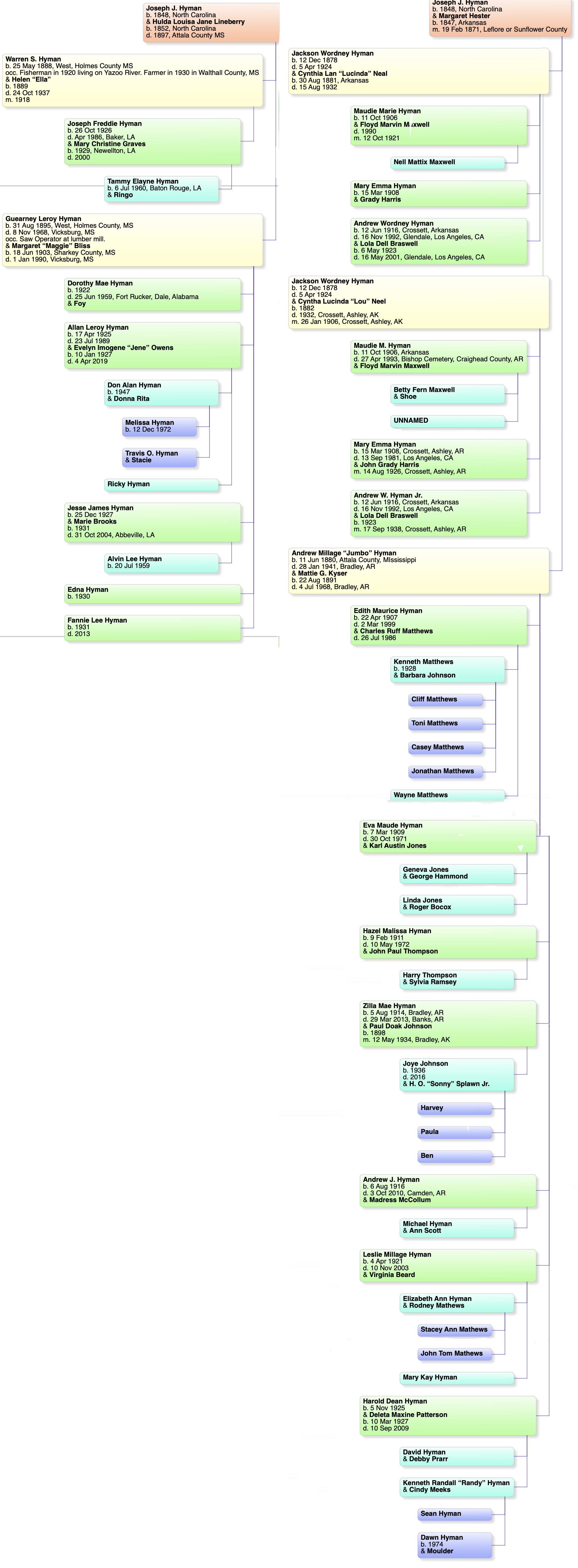 Joseph J. Hyman, was born in North Carolina, we think he first married a Margaret Hester and had two sons, Jackson Wordney and Andrew Millage. For unknown reasons that marriage ended and he married Hulda Louisa Jane Linebery Oakes, also born in North Carolina. She was a widow of Eliot H. Oakes. with whom she had five sons, one of which was Charles Franklin Oakes. Joseph J. Hyman, either was living in Attala County, MS at the time or moved there to marry Hulda, as she and her children were living there. Joseph and Hulda had two sons, Warren and Guearney. After her deat, Charles Franklin Oakes, their half brother, cared for them. He then moved to Vicksburg, MS and finally to Issaquena County, MS. In 1900, Andrew M. was living in Attala County, MS with the Whitehead Family. He was a lodger. No Census records on Jackson Wordney until he is married and in Arkansas. Both boys listed their mother as born in Arkansas. On Andrew’s census record in 1900, he said he can not read or write, however he signed his WWI Registration Card. (Note: some dates need correction.)