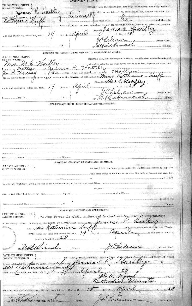James Russell "Buddy" Hartley was born March 24, 1908, to George Leroy and Mary Elizabeth Varner Hartley in Flora, MS. His siblings included, Alma Lee (Matthews), George Benjamin, Edward Lee, Leila Mae (Conrad), Samuel Richard, Margie Louise (Oakes), Marvin Ashley and Rudolf (still born). He married Vivian Katherine Huff in 1929. James was 21 and Katherine was 20. Katherine was born on July 29, 1909. They had a daughter, Vivian.