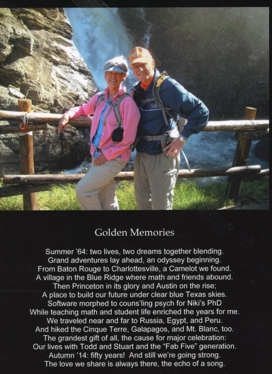 Jim and Niki met the summer after HS and married in 1964. After both graduated from LSU, they moved to Charlottesville where Jim would earn both his MA and PhD in Mathematics from the University of Virginia in 1968. Their children Todd and Stuart were both born in Charlottesville while they were there. Following graduation and before moving permanently to Austin in 1970, Jim taught at Princeton for two years.