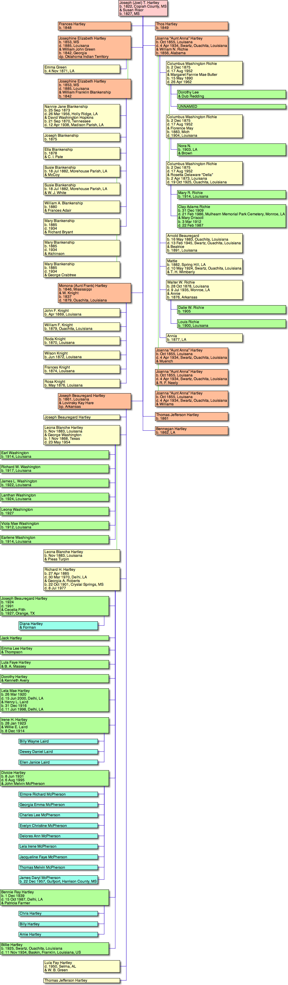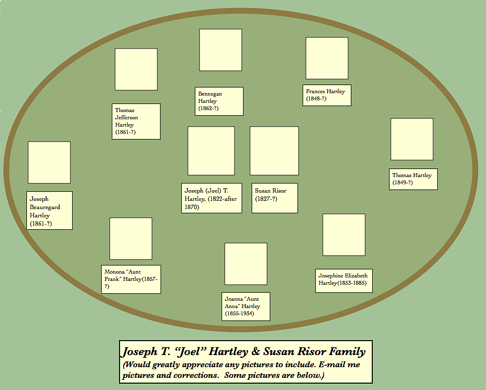 Joseph T. "Joel" Hartley was the eldest son of William H. and Fancy Taylor Hartley. He was born in 1822 in Copiah County, MS. He married a Choctaw Indian Lady (supposedly from around Utica, MS) and had 11 daughters and twin sons. Joel left MS after killing a man over a turkey shoot. One of his daughters maybe married a man name Curtis. They had a son named Newton and lived in Bastrop, Louisana. Later Newton went to Springhill, LA. In the Bureau of Land Management Web Site there is a Joel Hartley in Copiah County Mississippi who got land from federal government on May 10, 1826 and a Joseph got land on 26 Dec 1826. In 1853, the Mississippi State and Territorial census lists a Joel T. Hartley with one male and four females in the household. In the 1860 census, they are in Ward 12, Morehouse, Louisiana. In the 1870 census, they are listed in Ward 1, Ouachita, Louisiana under J. T. Hartly.