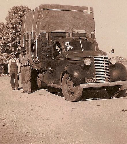 Alvie Ray and Zoda Pearl Ashley (in truck), at J.K. Nakayama's vegetable farm, Cloudcroft, New Mexico. That may be Mr. Nakayama on left. |