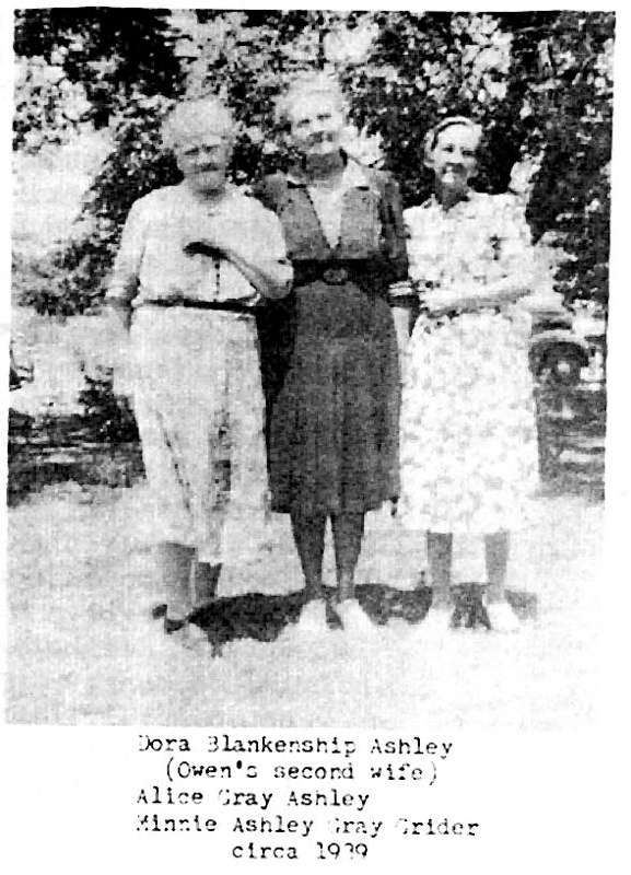 Dora Castleman Blankenship Ashley (second wife of Owen Ashley), Alice Gray Ashley ( sister of Owen’s first wife Mary Jane Gray and wife of Owen’s brother, John Hartley Ashley), & Malinda “Minnie Bell” Ashley Gray Grider,(daughter of Thomas & Malinda Ashley, wife of William David Gray and William D. Grider). 1939 |