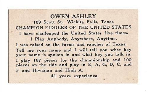 Owen Ashley’s Business Card, Owen died after being hit by a car while crossing the street. His fiddle is owned by Melba Ashley, Gary Ashley’s mother. |